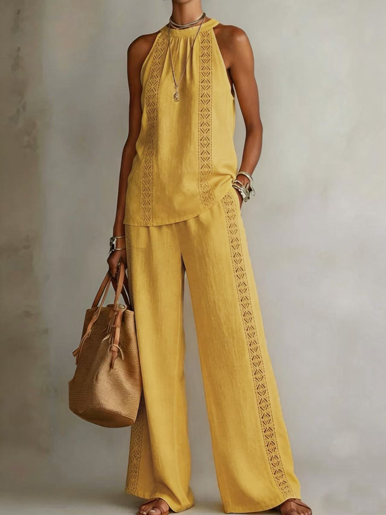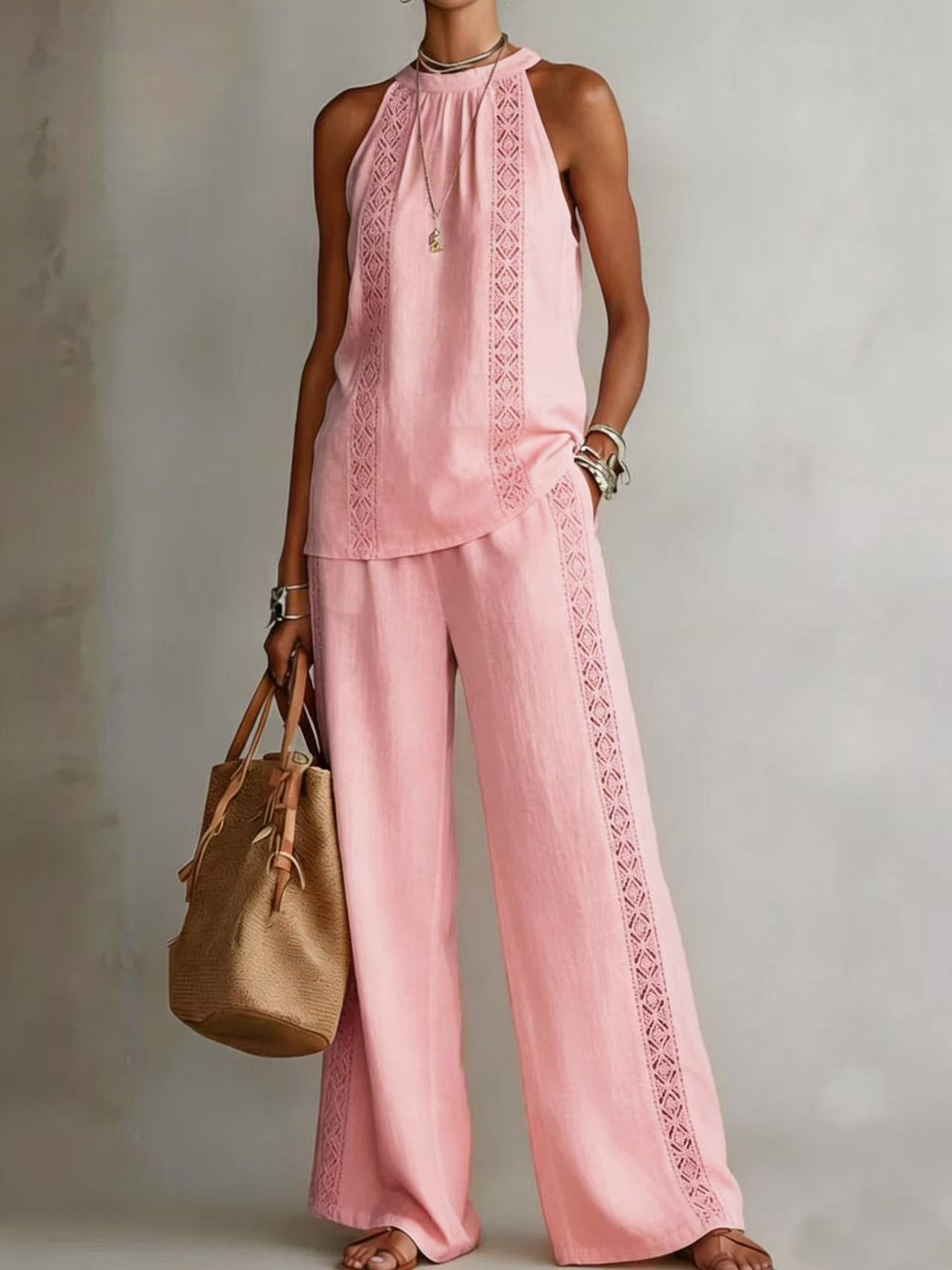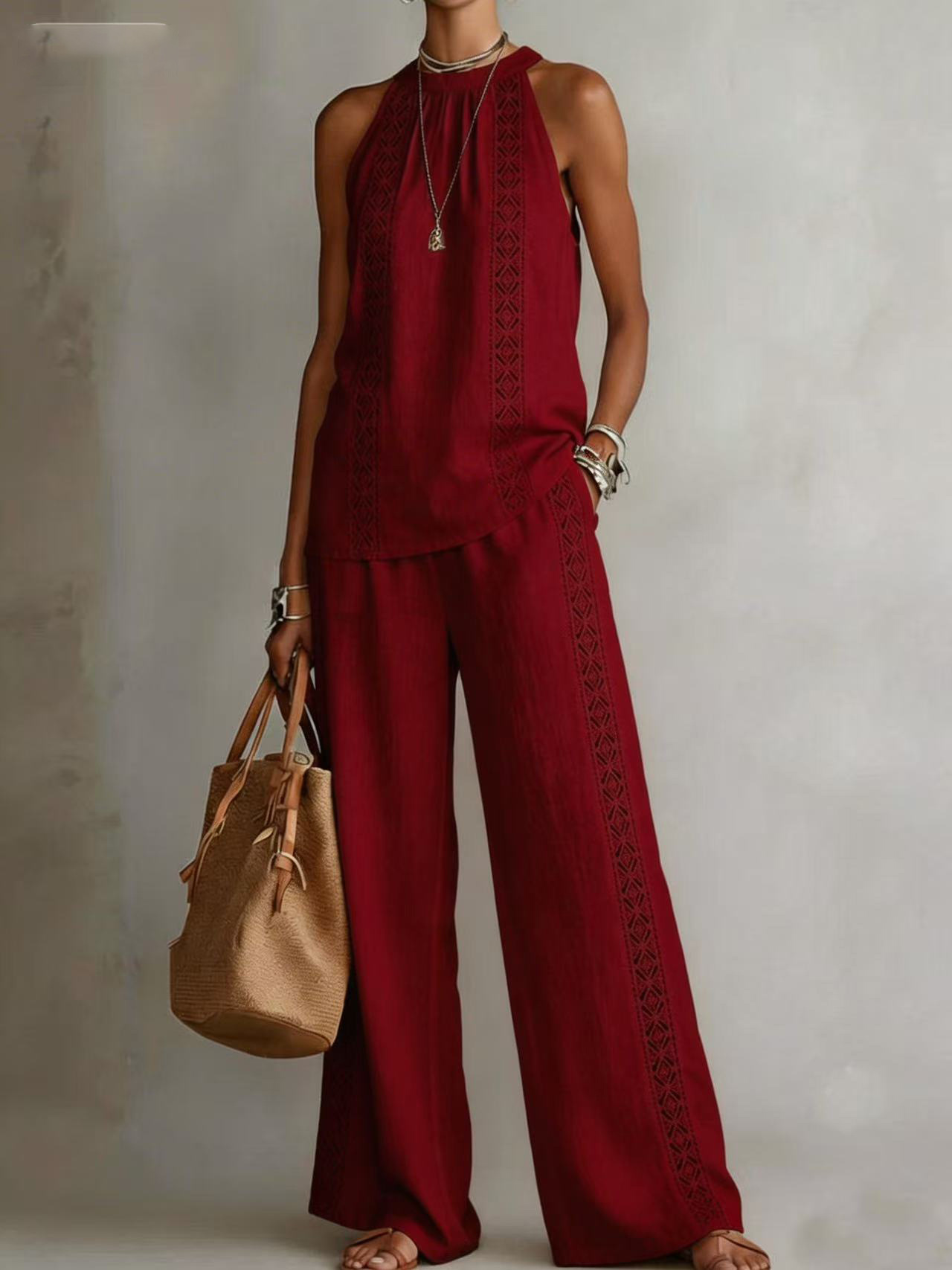 Womens Retro Lace Sleeveless Top And Wide-Leg Pants Two-Piece Set