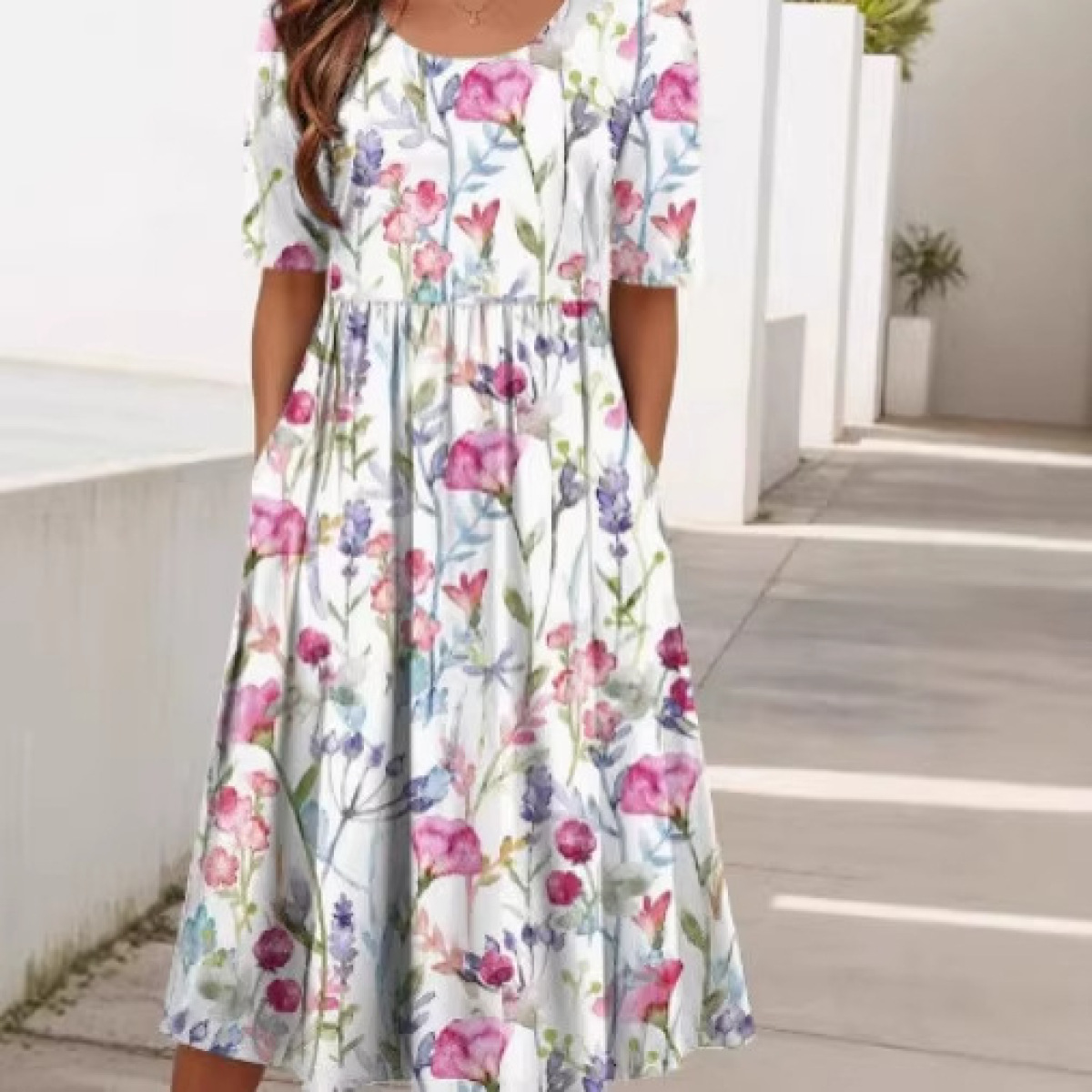 Womens Round-Neck Mid-Waist Printed Swing Dress