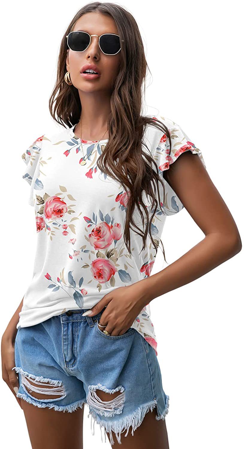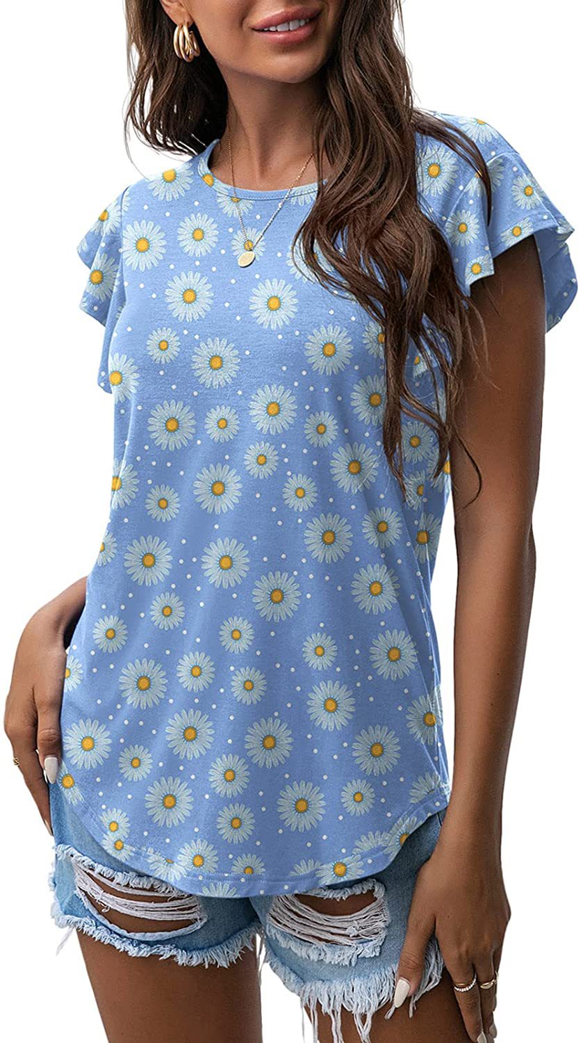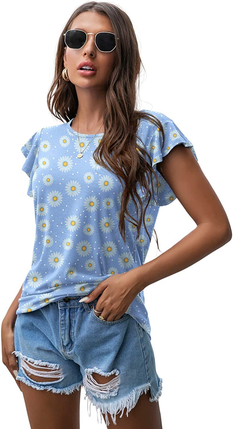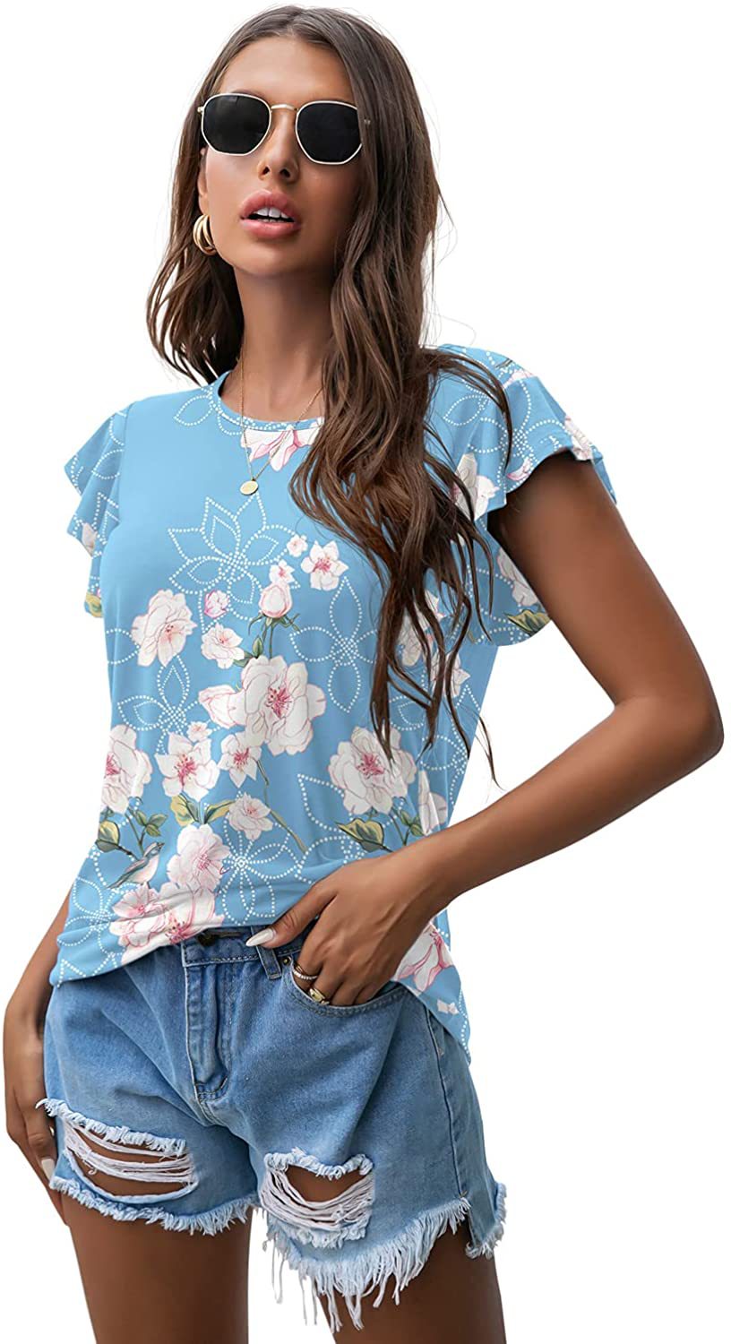 Women's Round Neck Printed Ruffled Short Sleeve T-shirt