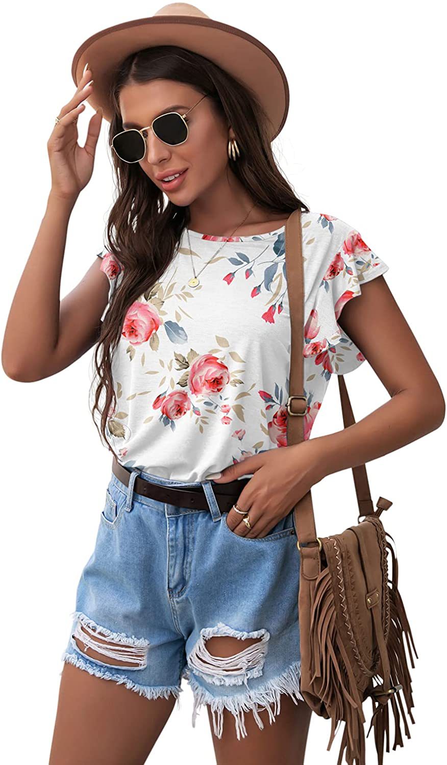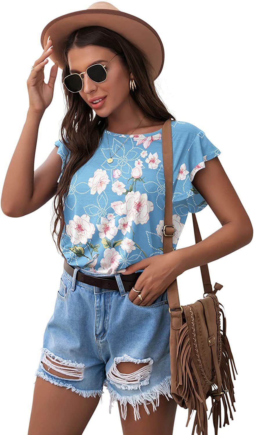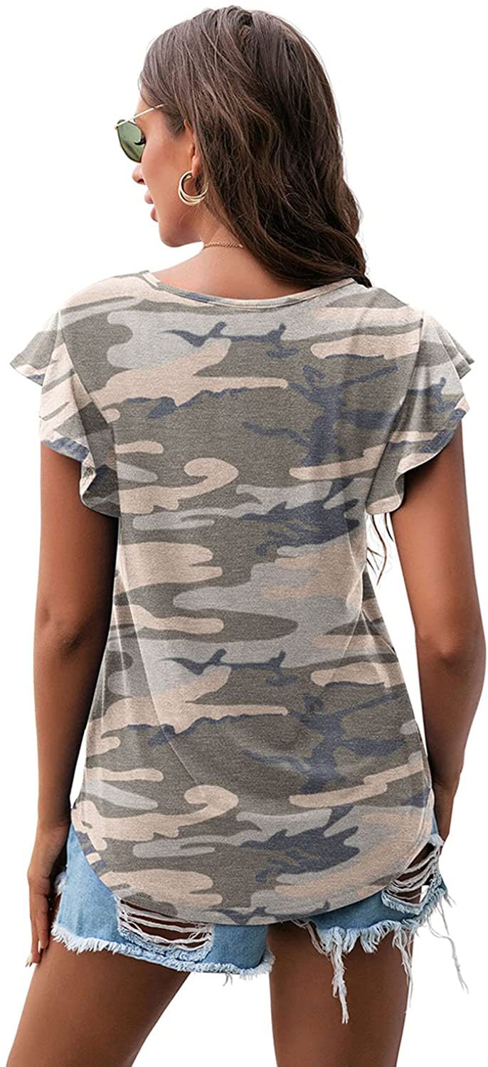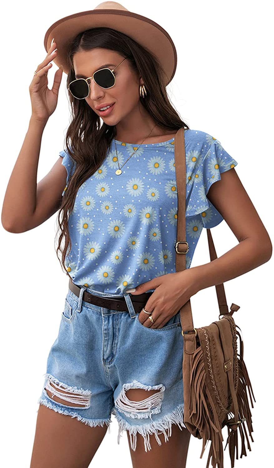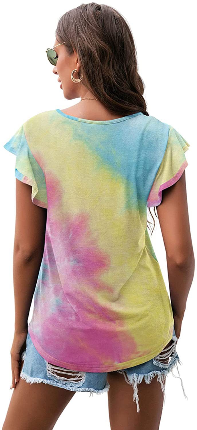 Women's Round Neck Printed Ruffled Short Sleeve T-shirt