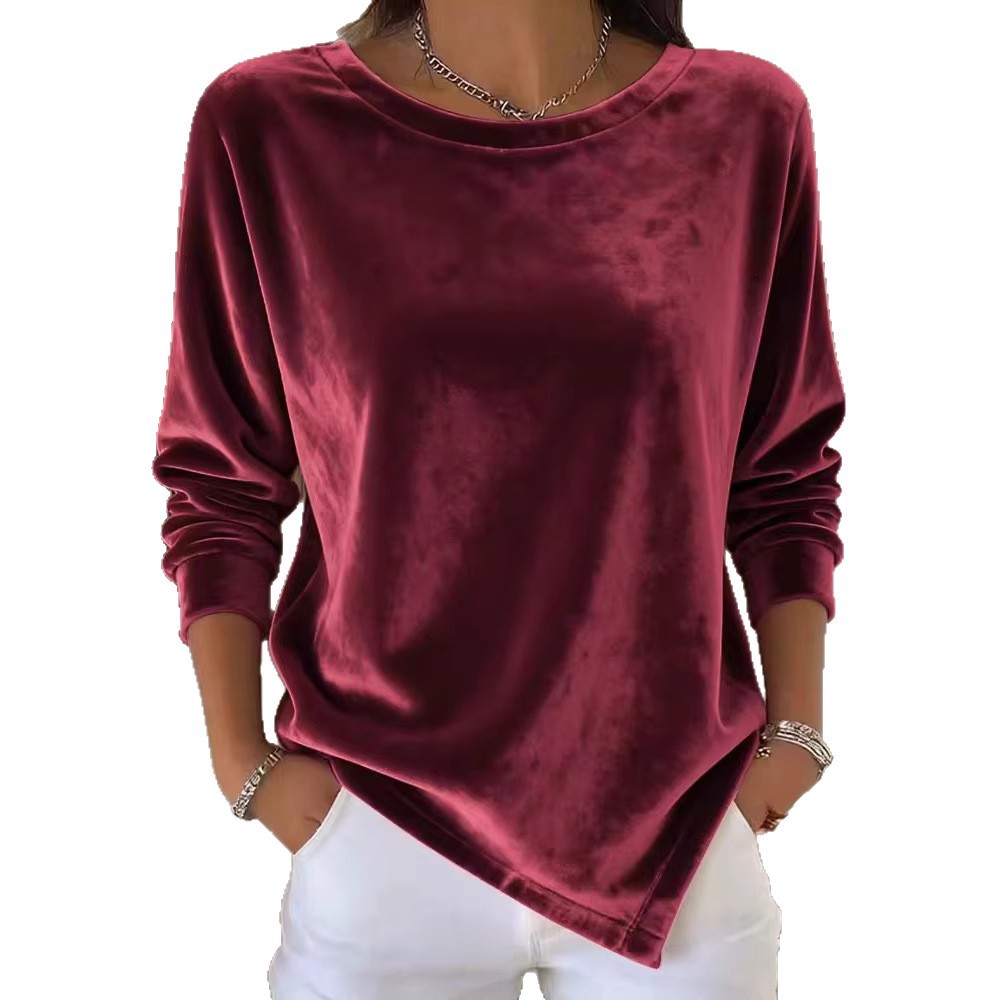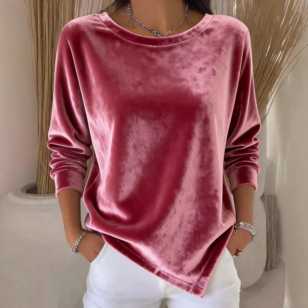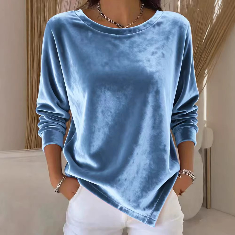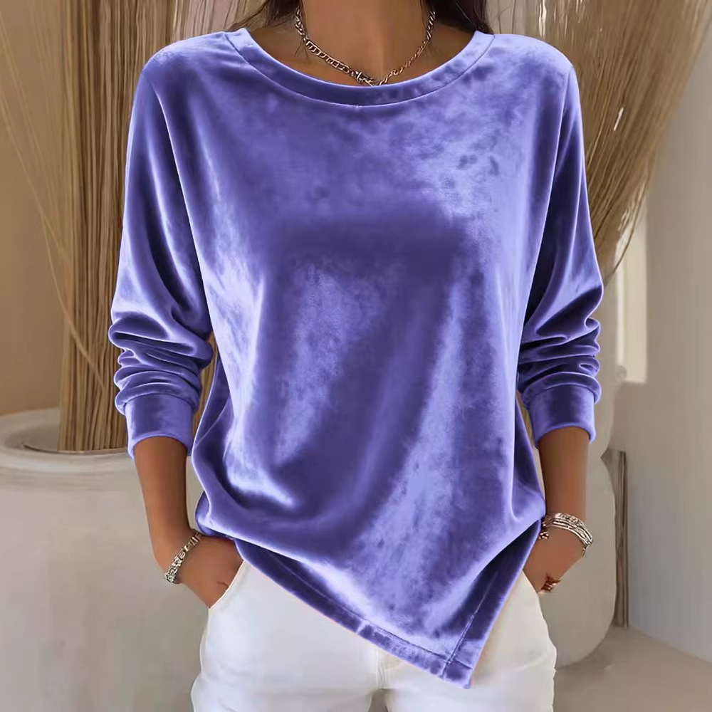 Womens Round-Neck Velvet Solid-Color Long-Sleeve Blouse
