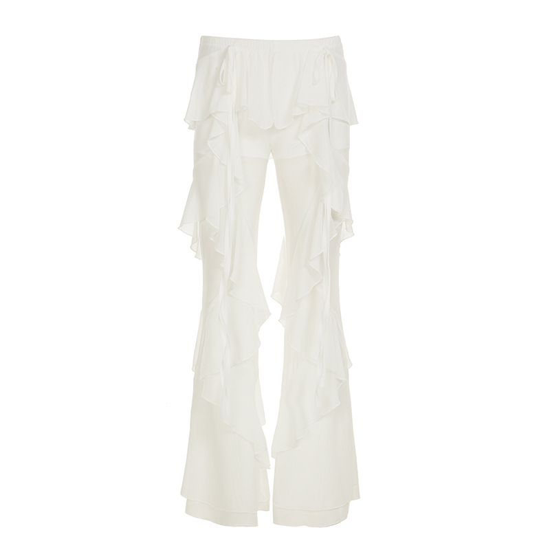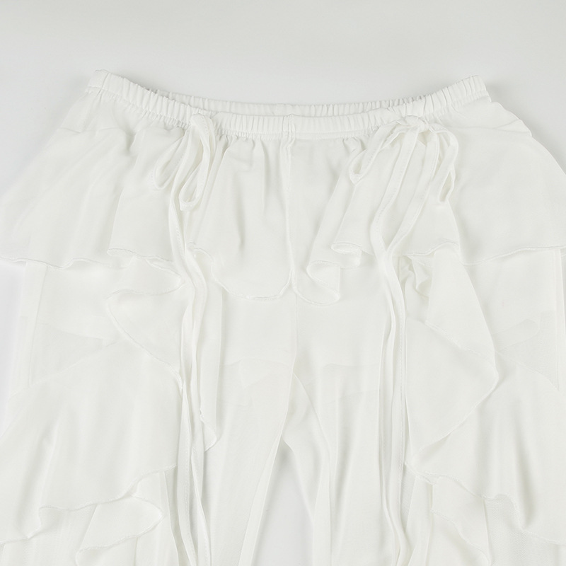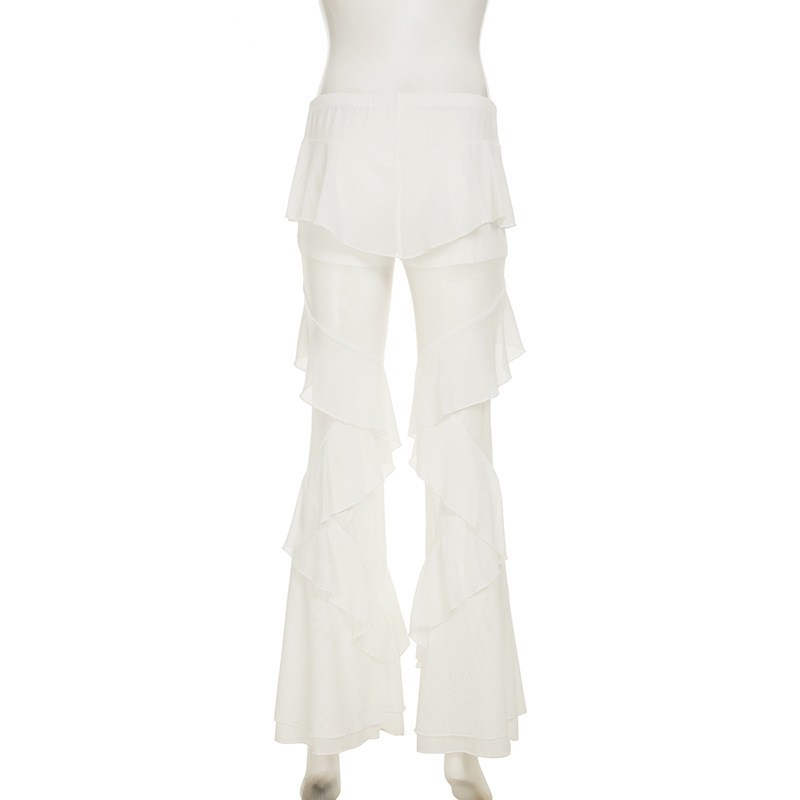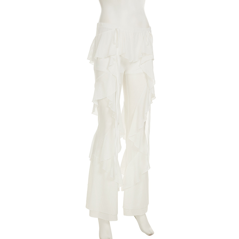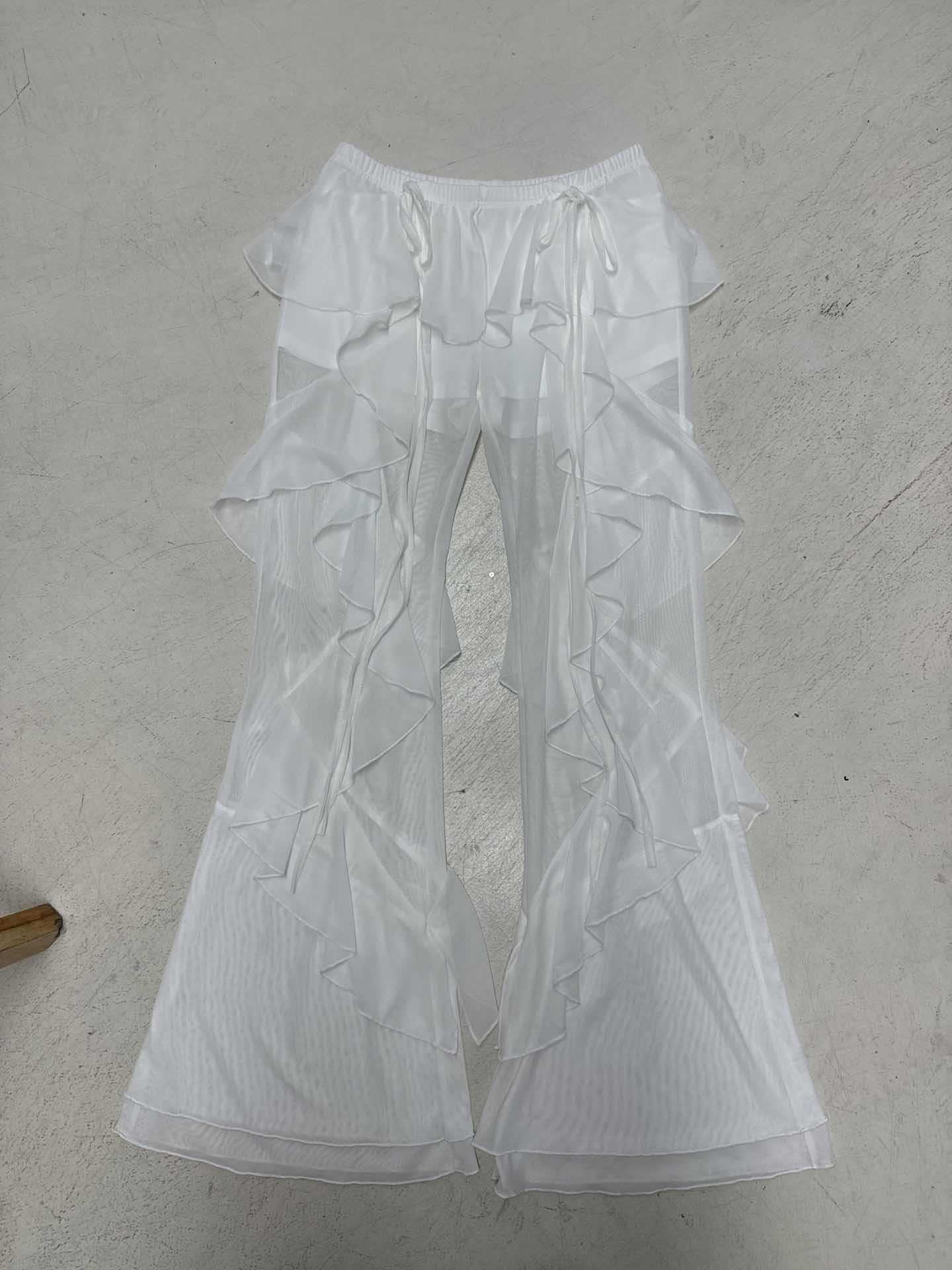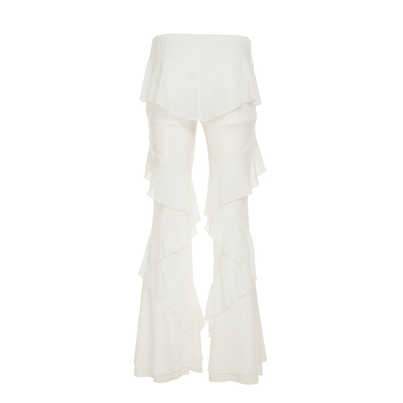 Womens Ruffle-Trimmed, Layered Mesh Pants