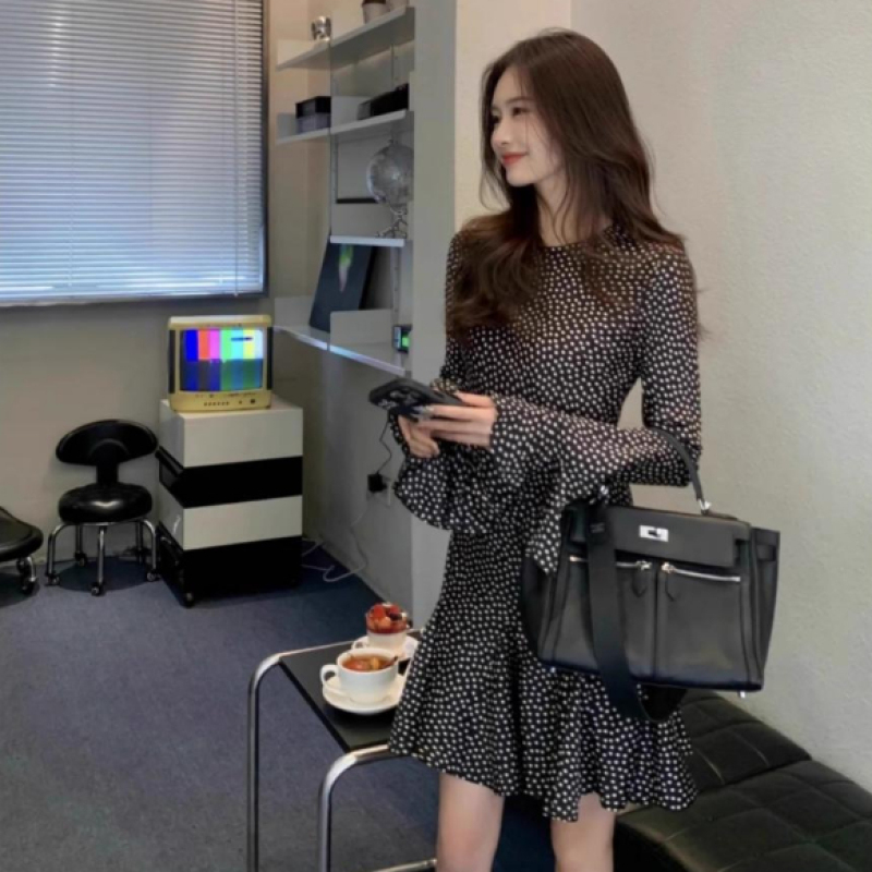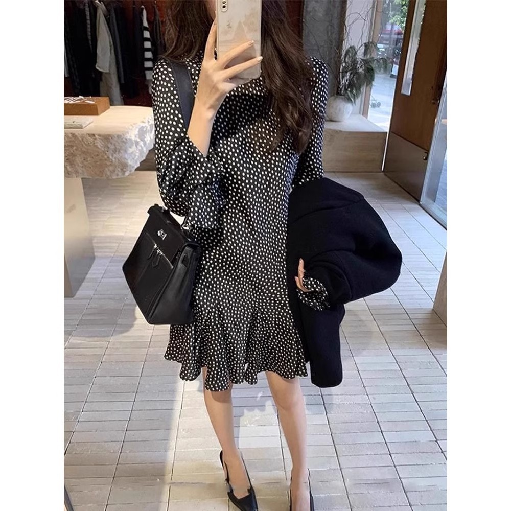 Womens Ruffle-Trimmed Polka-Dot Flare-Sleeve Dress