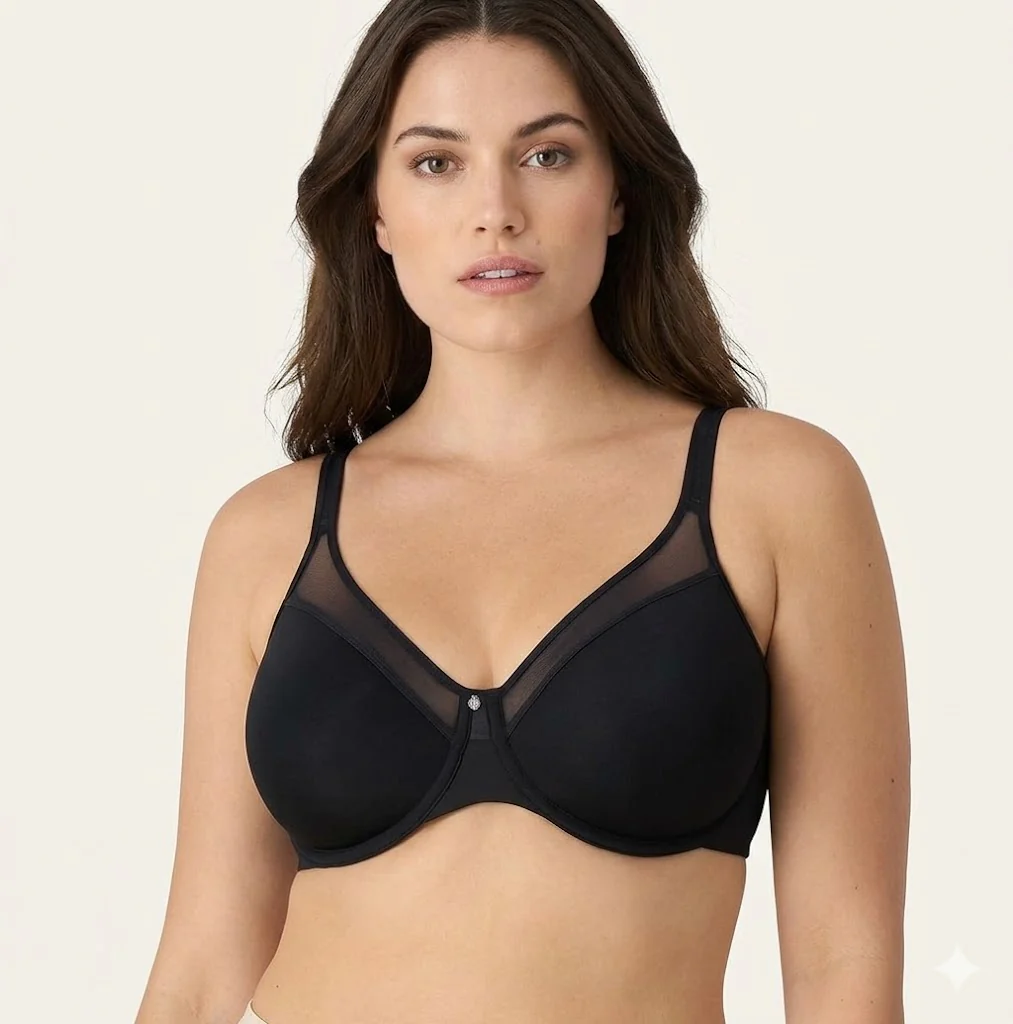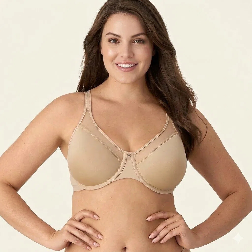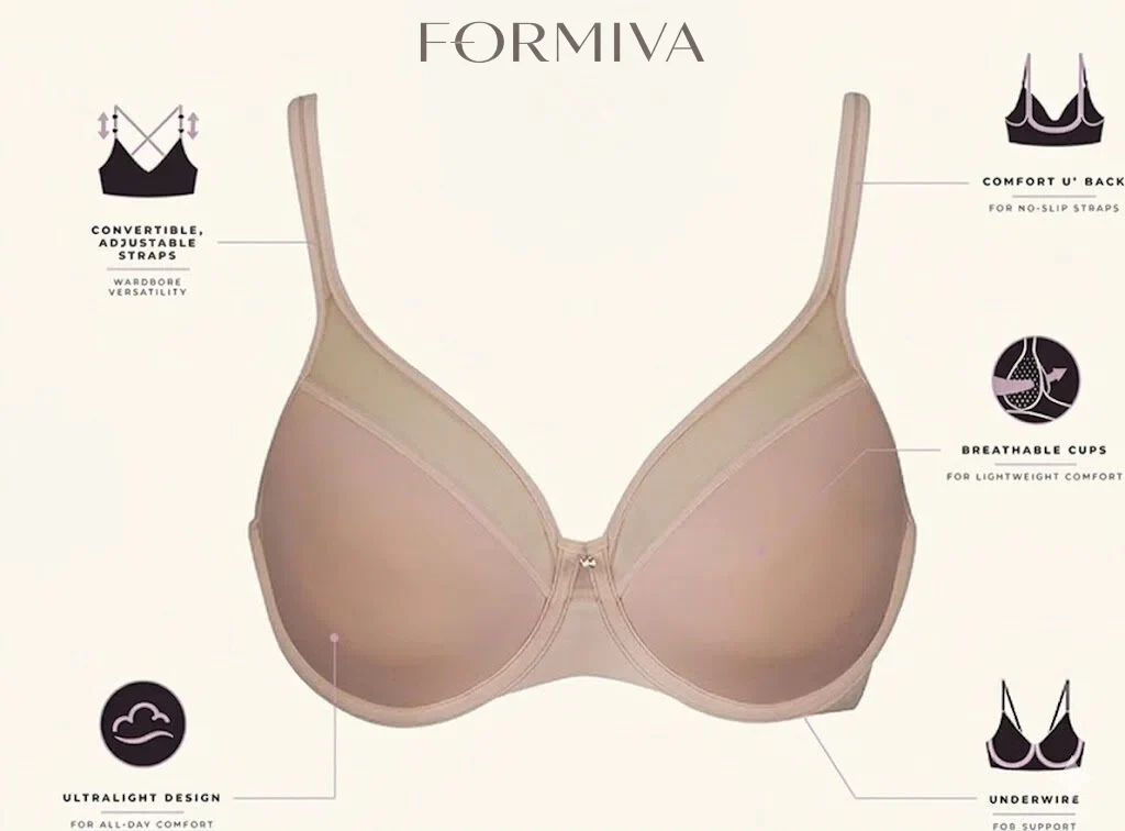 Stay smooth, supported, and comfortable with the Formiva One Smooth U Ultra Light Underwire T-Shirt Bra for women. Designed with ultra-light cups and a soft breathable spacer lining, this bra provides natural shaping without extra bulk. The seamless construction creates a sleek, invisible look under tees, blouses, and dresses, making it a go-to everyday t-shirt bra. An inner side sling enhances shaping and support, while the built-up two-ply back with a deep U design delivers smoothing and flexibility for low-back outfits. Comfort-U convertible straps stay in place and adjust easily for traditional or crisscross wear. Finished with a sheer neckline detail and center charm, this women’s underwire bra combines modern comfort with a polished, feminine touch.