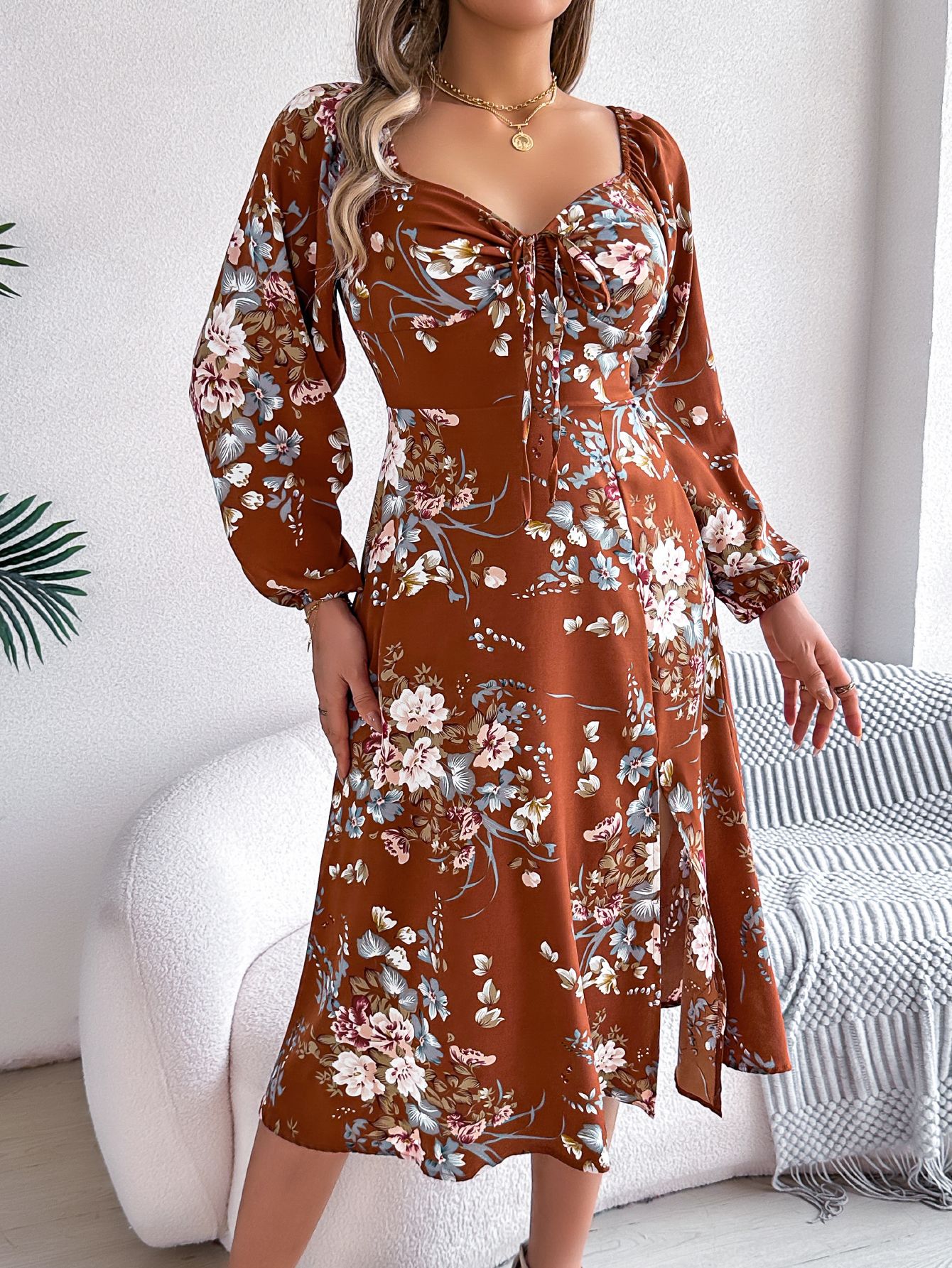 Womens Sexy Lace-Up Knot-Details Floral Long-Sleeve Slit Dress