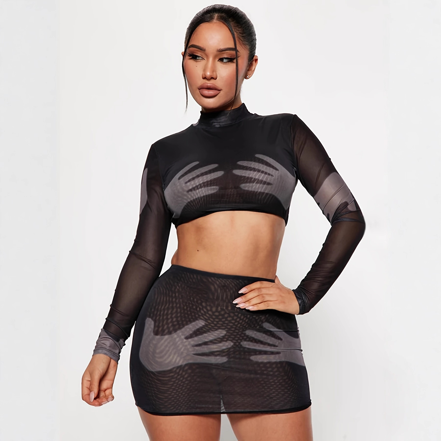 Womens Sexy Mesh-Panel Long-Sleeve Skirt Set