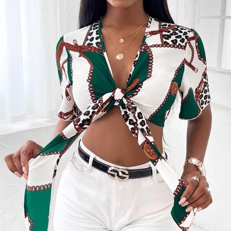 Women's Shirt Bow Tied Shirt Summer Short Sleeve Printed Top