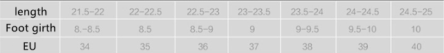 Size: 34, 35, 36, 37, 38, 39, 40, 41, 42, 43