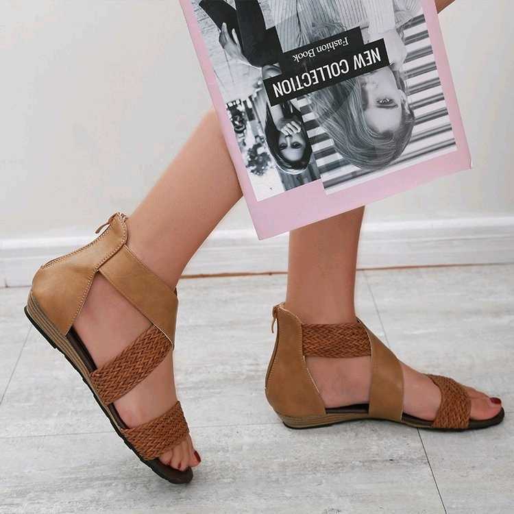 Women's Shoes Summer Large Size Straw Woven Back Zipper Flat Fish Mouth Sandals