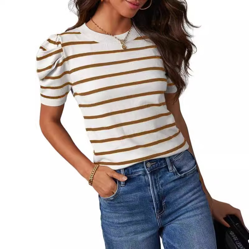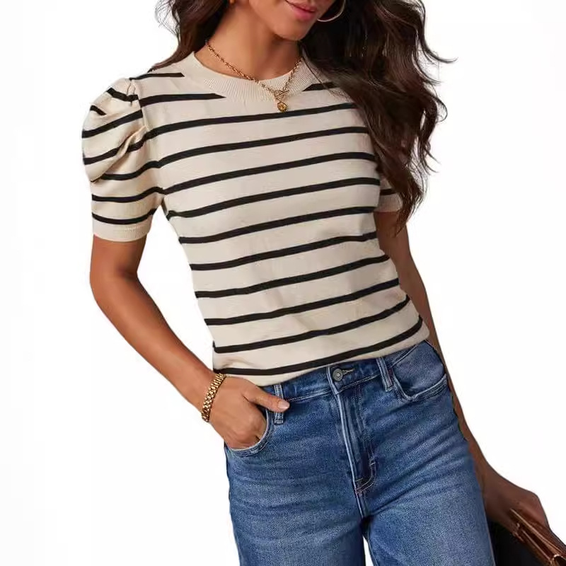 Women's Short Puff Sleeve Knitted Top Striped T-shirt