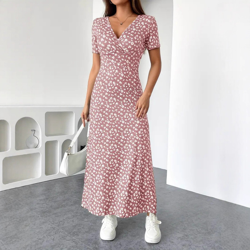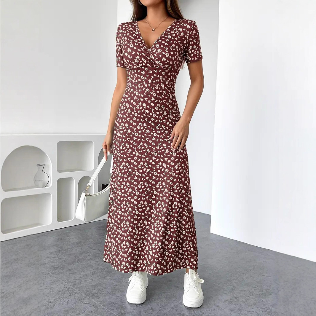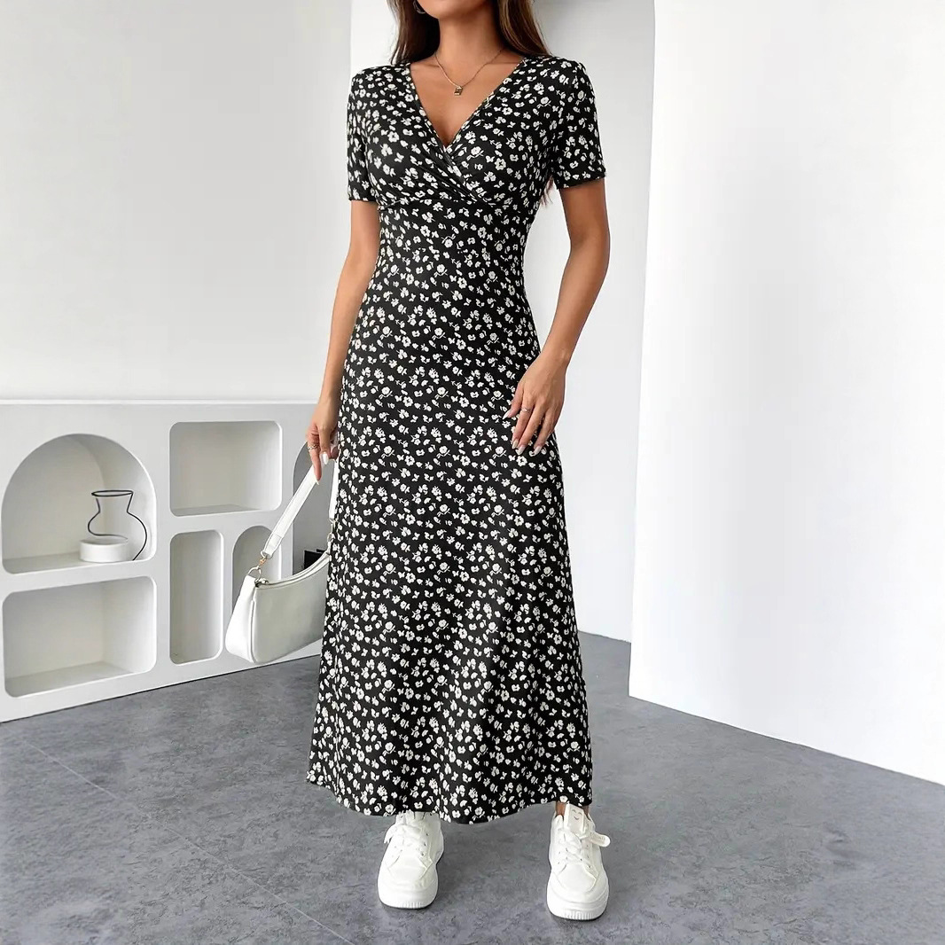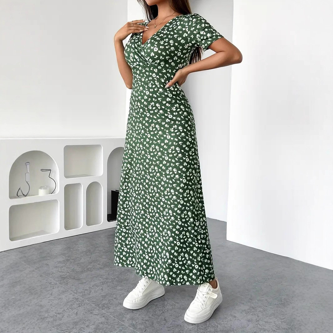 Womens Short-Sleeve Mid-Length Floral V-Neck Dress