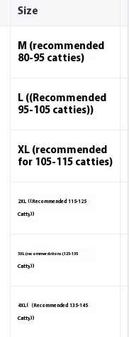Size: M (recommended 40.00 kg-47.50 kg, L (recommended 47.50 kg-55.00 kg, XL (recommended 55.00 kg-60.00 kg, 2XL (recommended 60.00 kg-65.00 kg, 3XL (recommended 65.00 kg-70.00 kg, 4XL (recommended 70.00 kg-77.50 kg