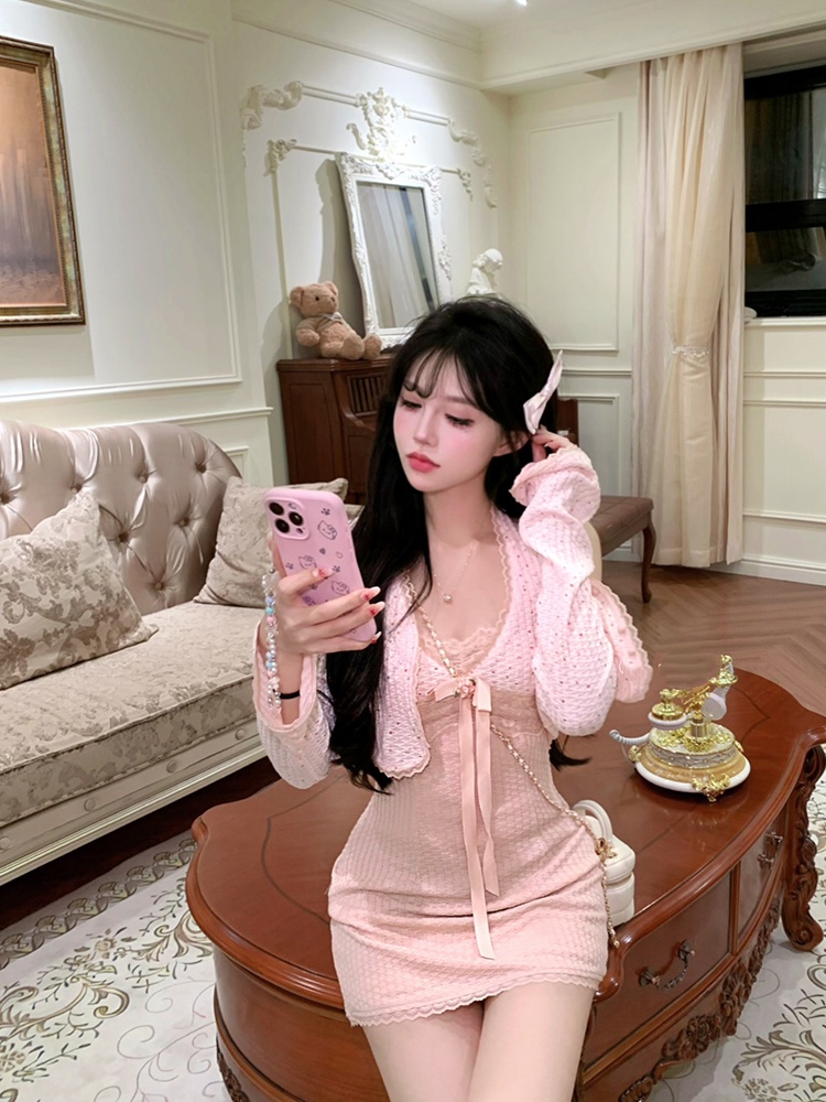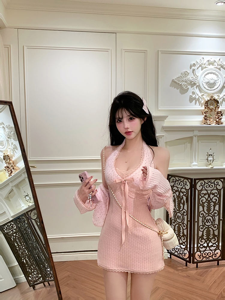 Color classification: pink halter knitted dress, pink long sleeve cardigan