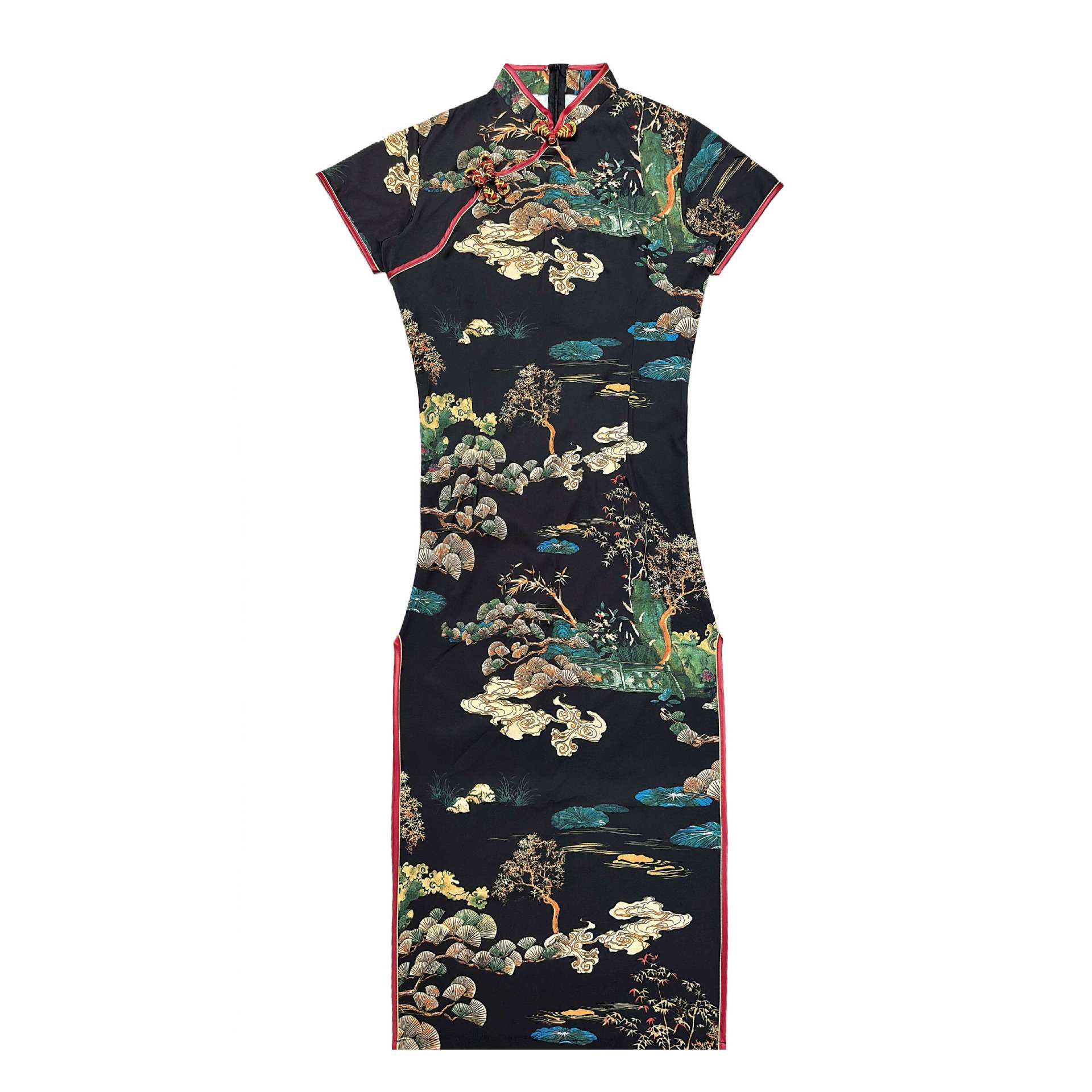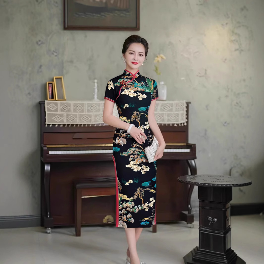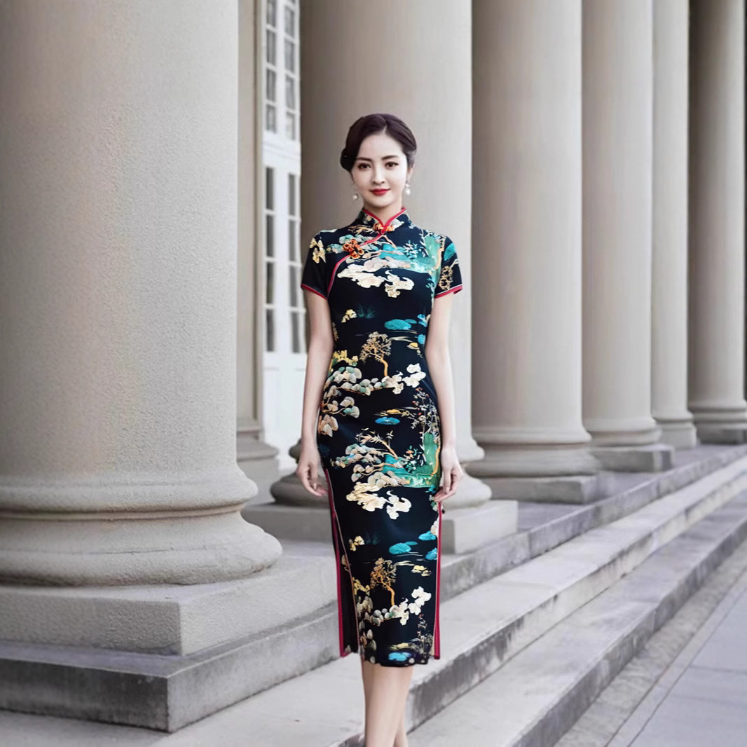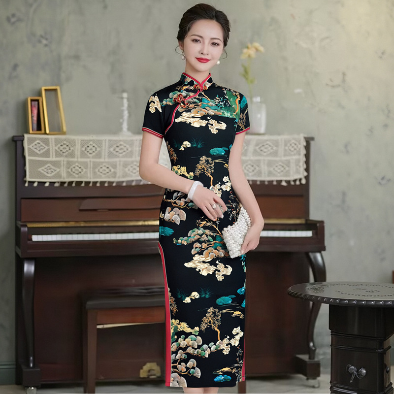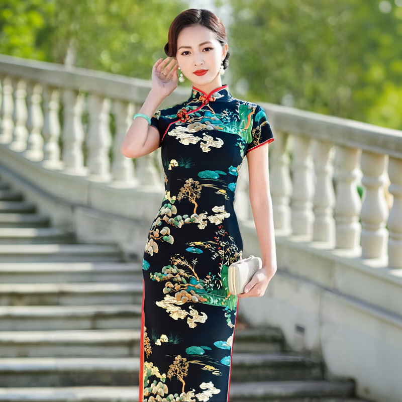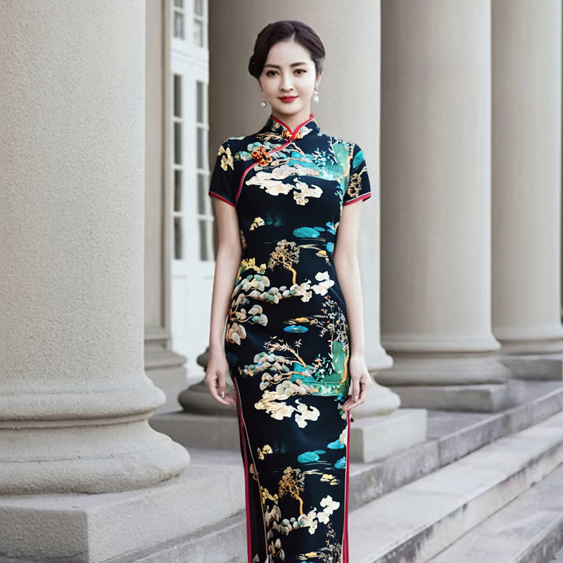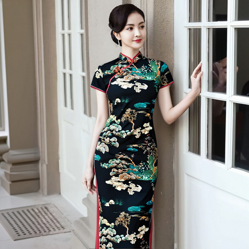 Color: Short-sleeve long cheongsam (Lingyun Song) — Black