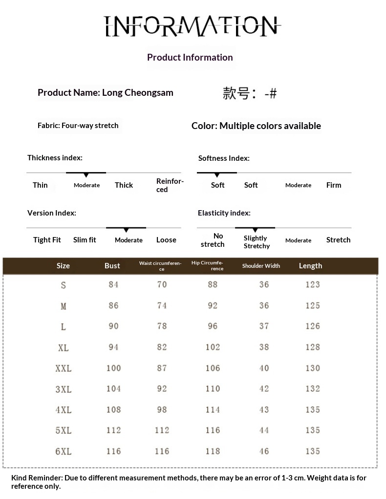 Sizes: S (suitable for 85–95 jin), M (suitable for 95–105 jin), L (suitable for 105–115 jin), XL (suitable for 115–125 jin), 2XL (suitable for 125–135 jin), 3XL (suitable for 135–145 jin), 4XL (suitable for 145–155 jin), 5XL (suitable for 155–165 jin), 6XL (recommended for those weighing 165–175 jin)