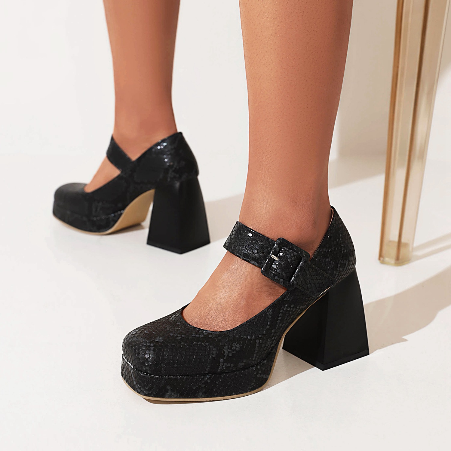 Women's Snake Pattern Black And White Wear Big Head Solid Color Chunky Heel Pumps