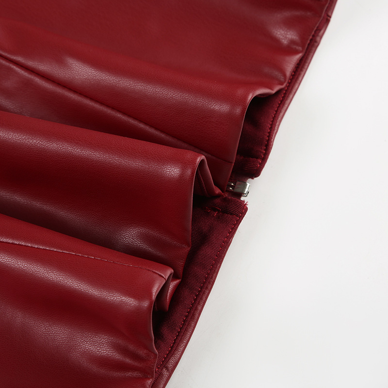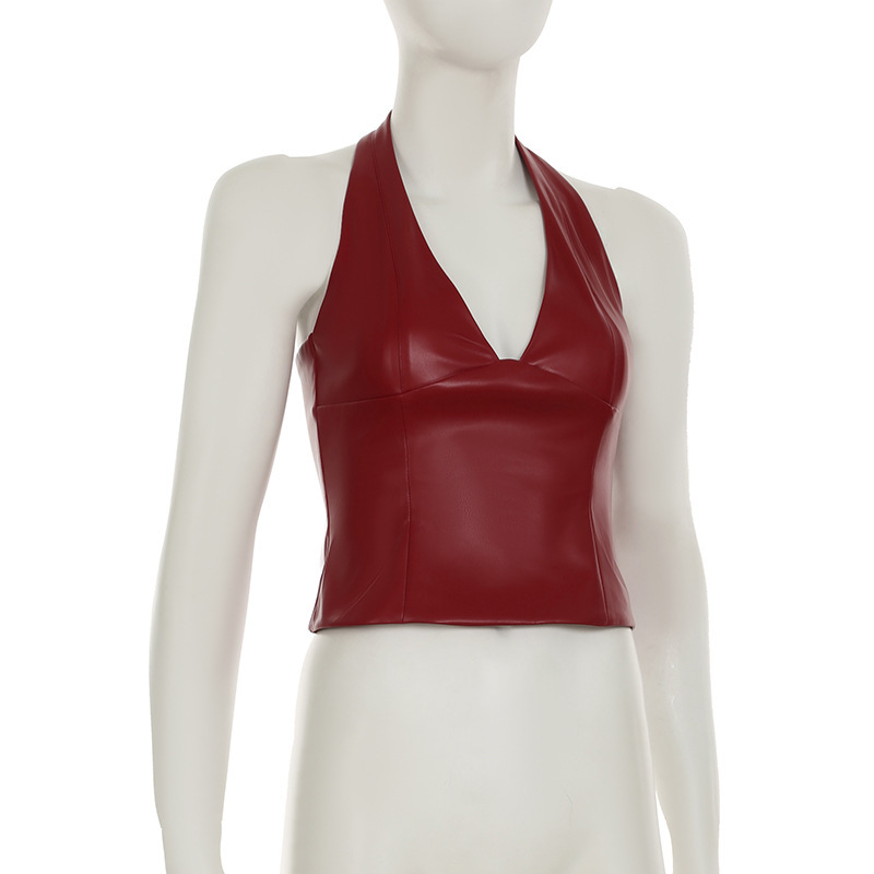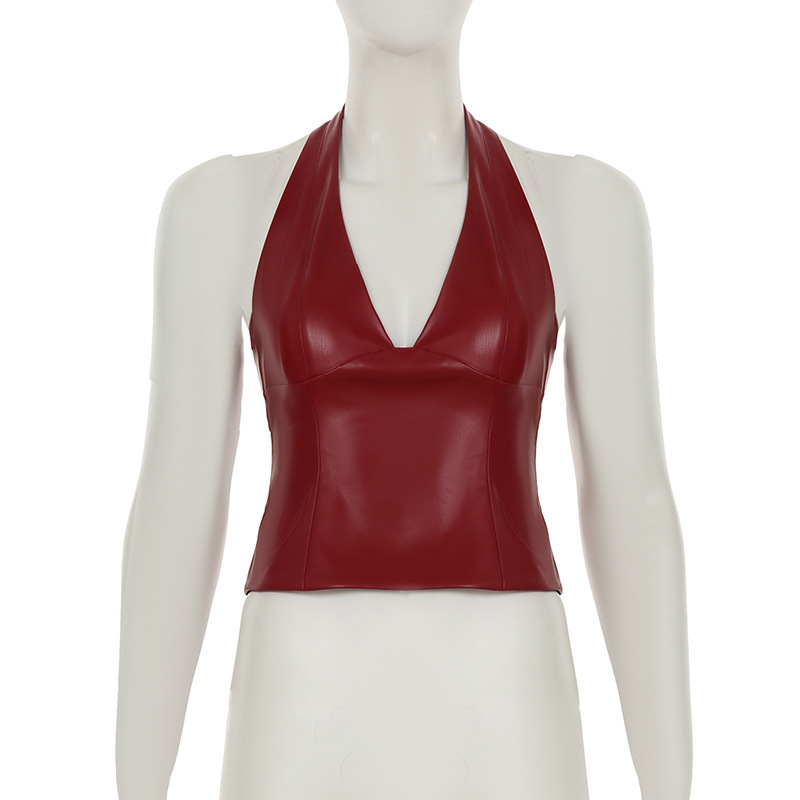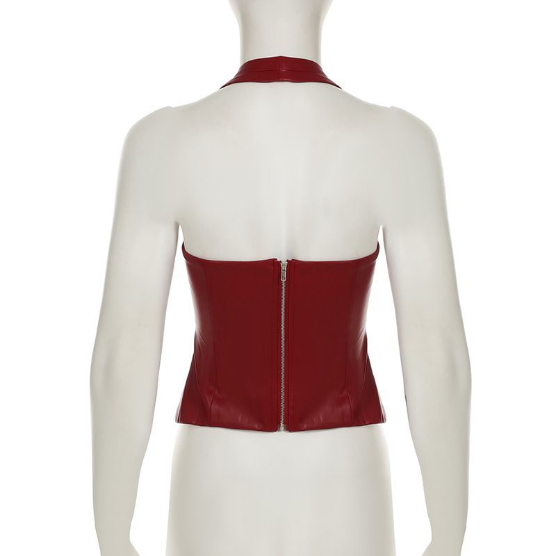 Women's Solid Color And V-neck Leather Halter Back Zipper Vest