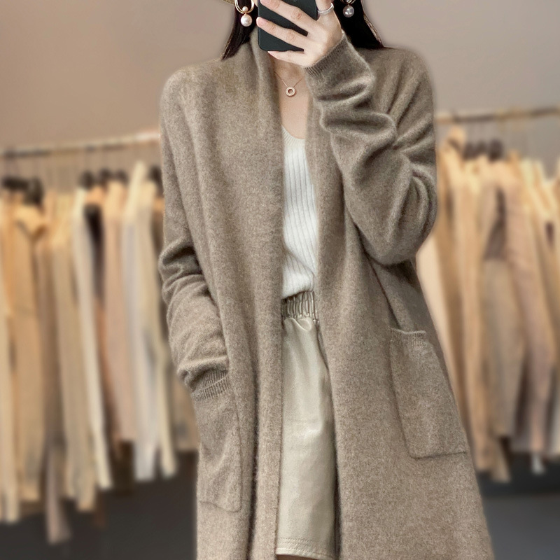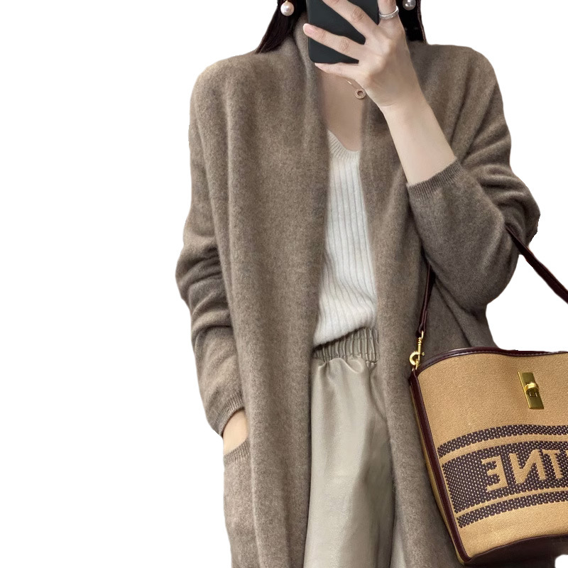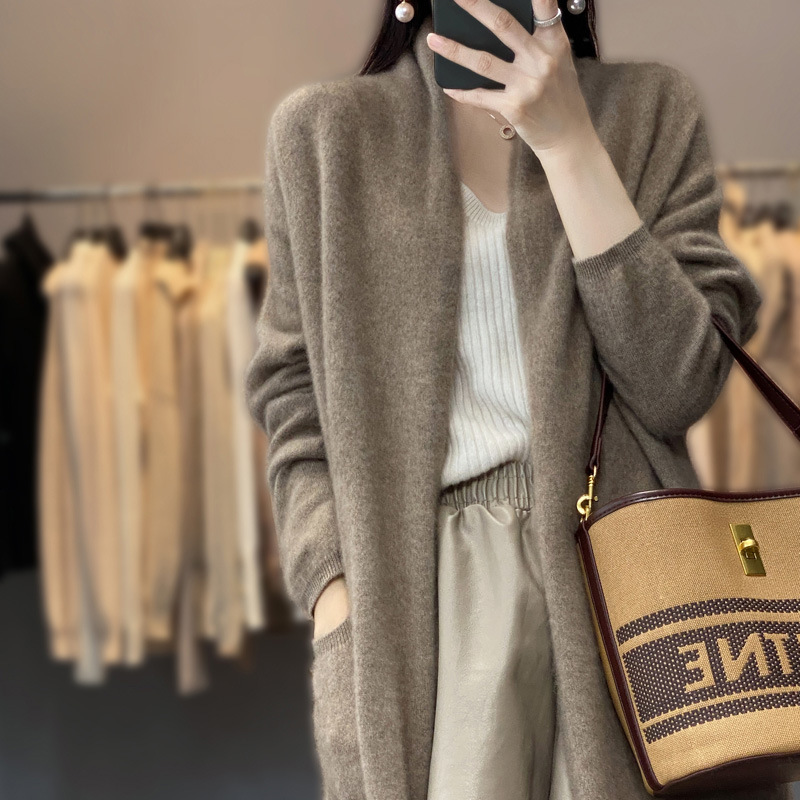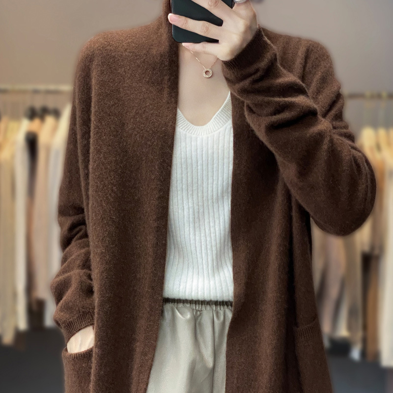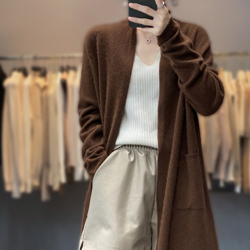 Women's Solid Color And V-neck Mid-length Casual Wool Cardigan