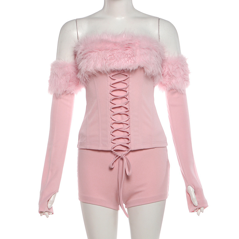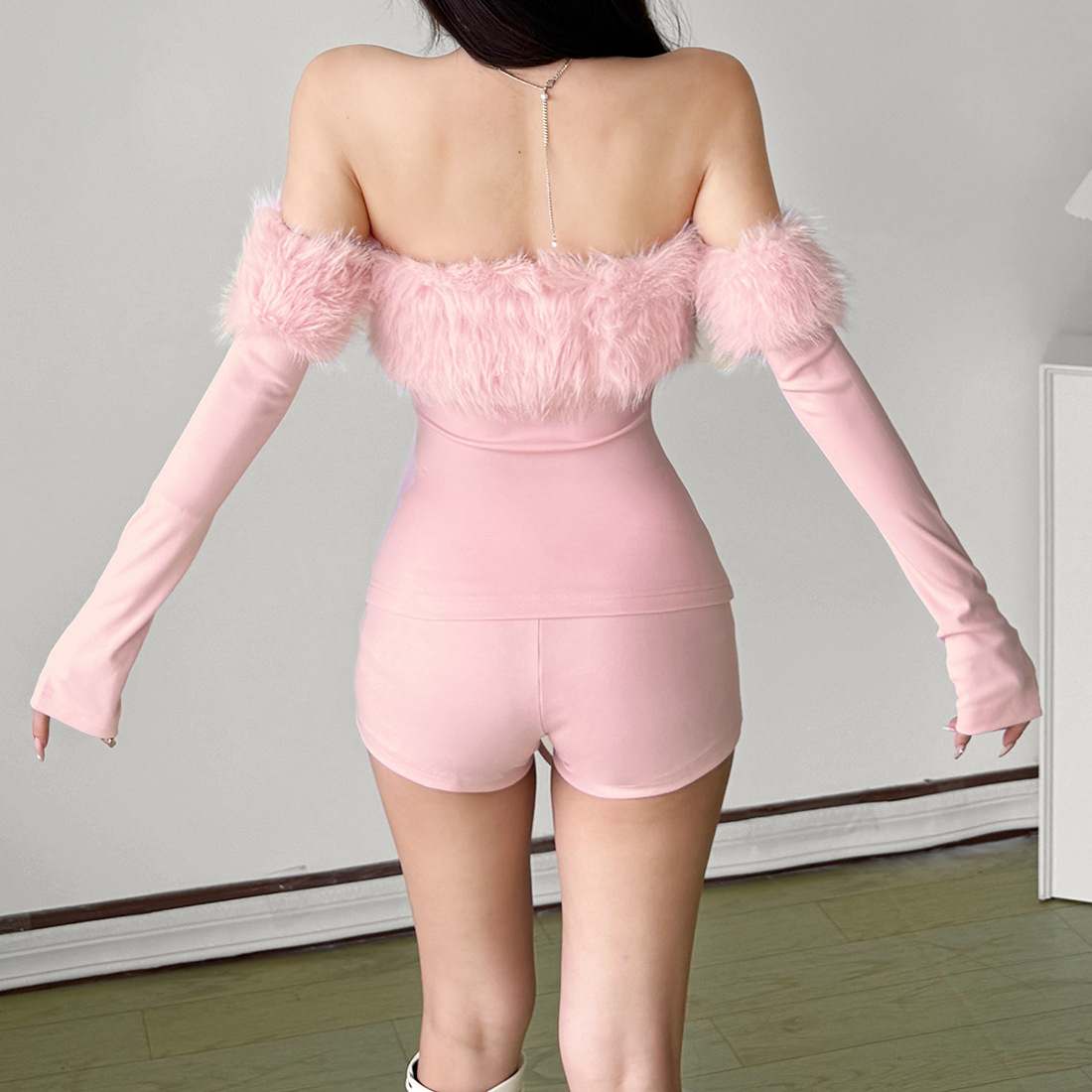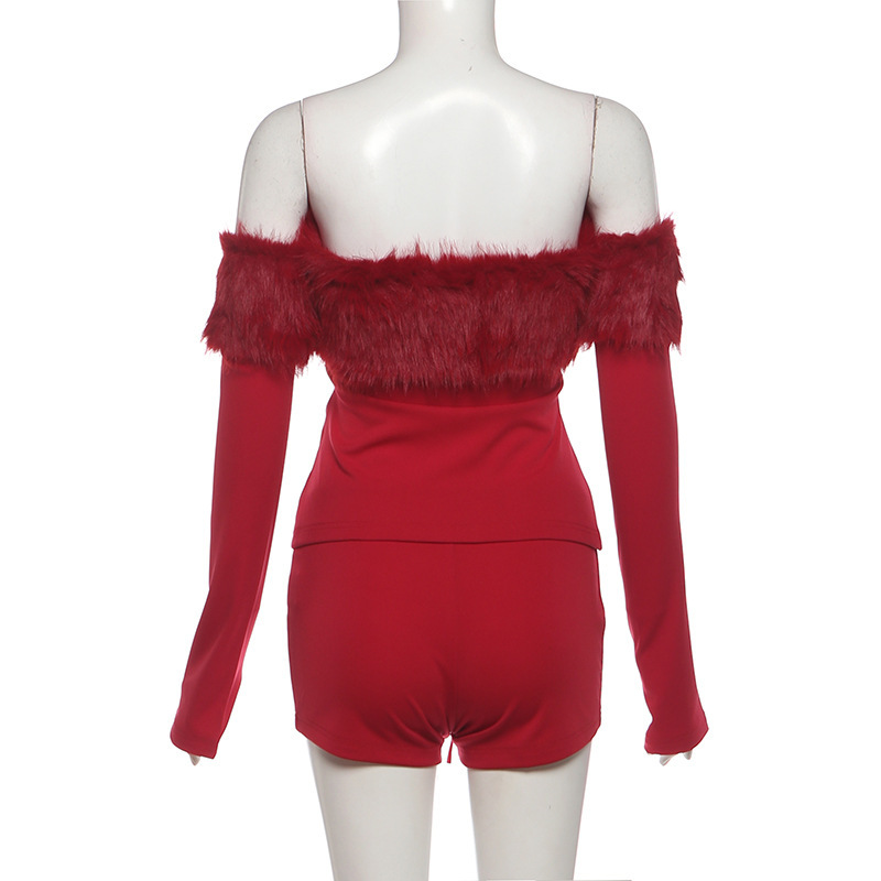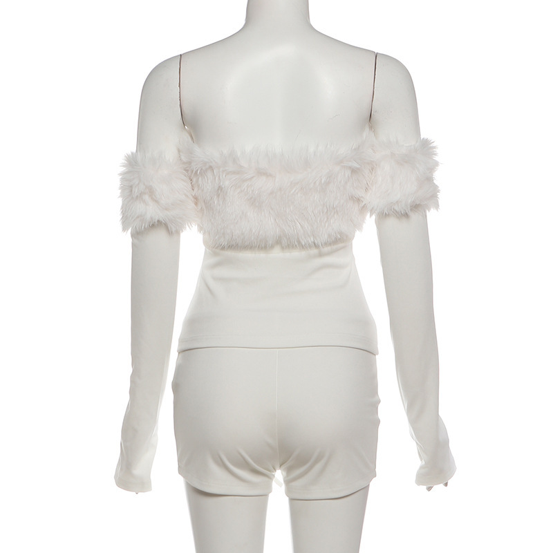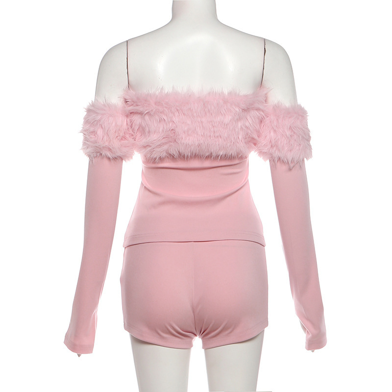 Womens Solid-Color Fluffy Patchwork Long-Sleeve Halter Top And Shorts Set