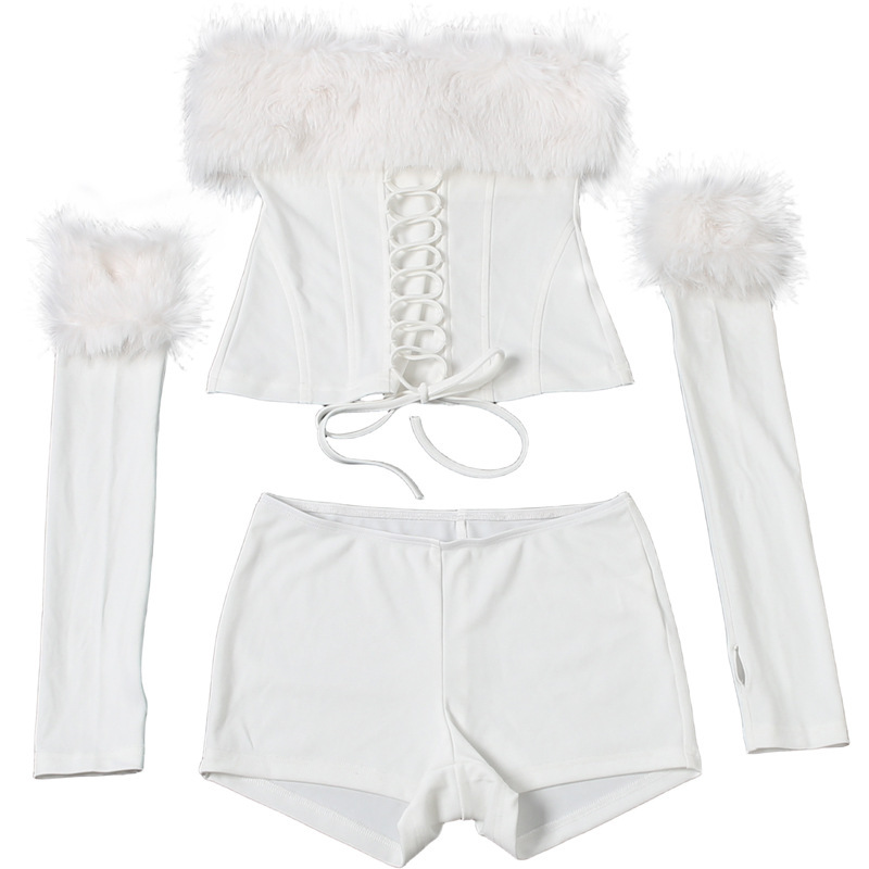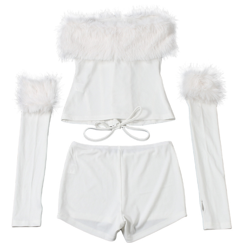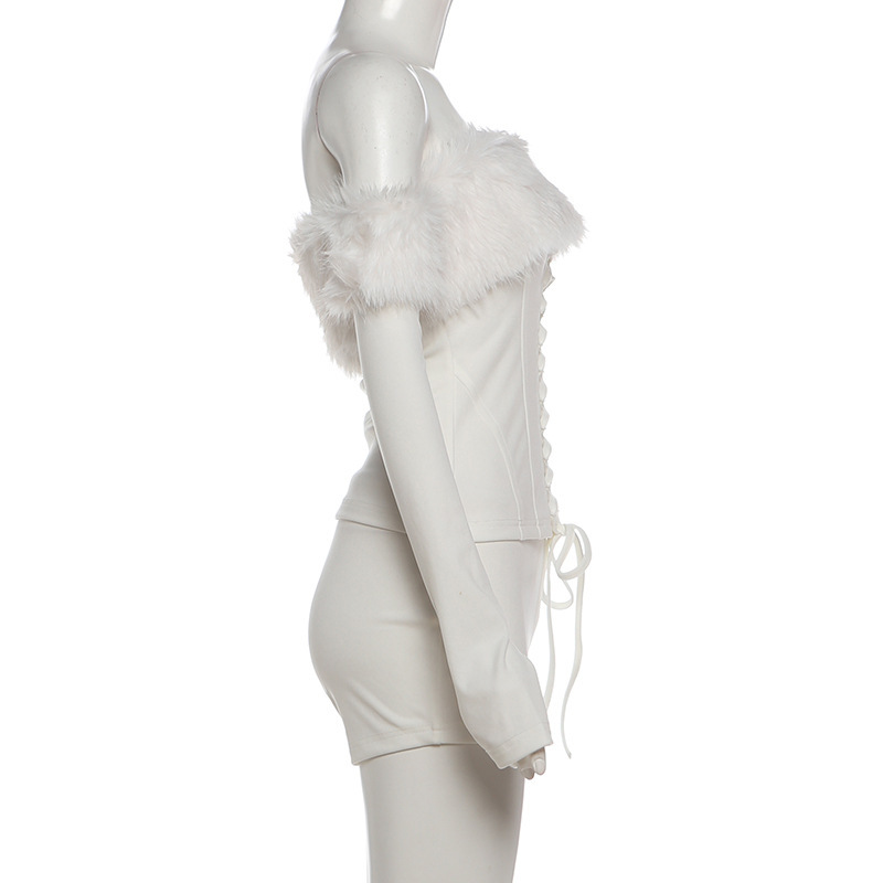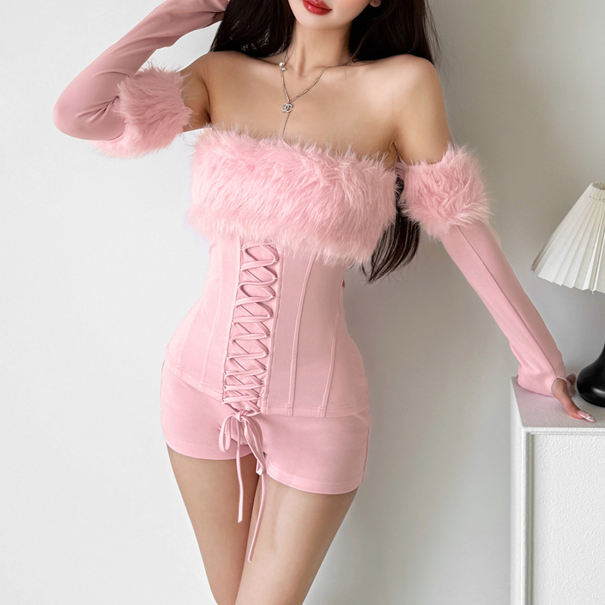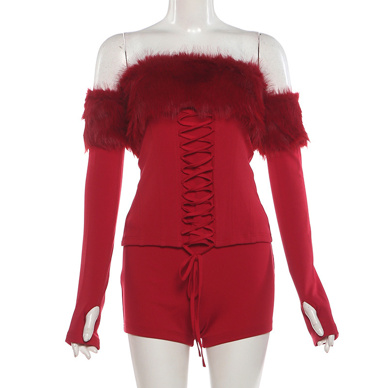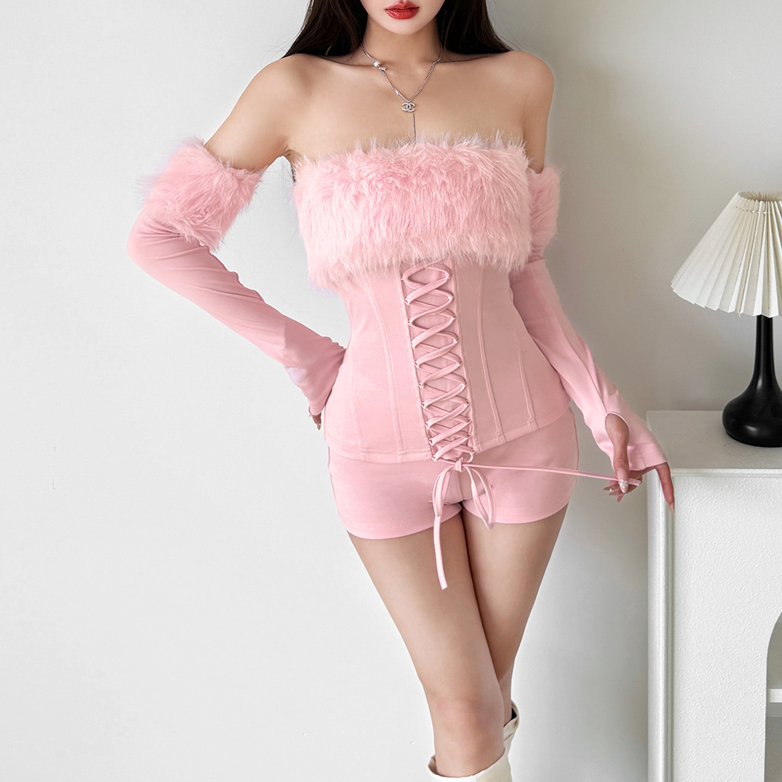 Womens Solid-Color Fluffy Patchwork Long-Sleeve Halter Top And Shorts Set