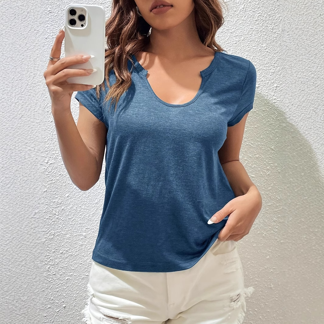 Women's Solid Color Notched V-neck Short Sleeve Top Summer Loose Knit T-shirt Top