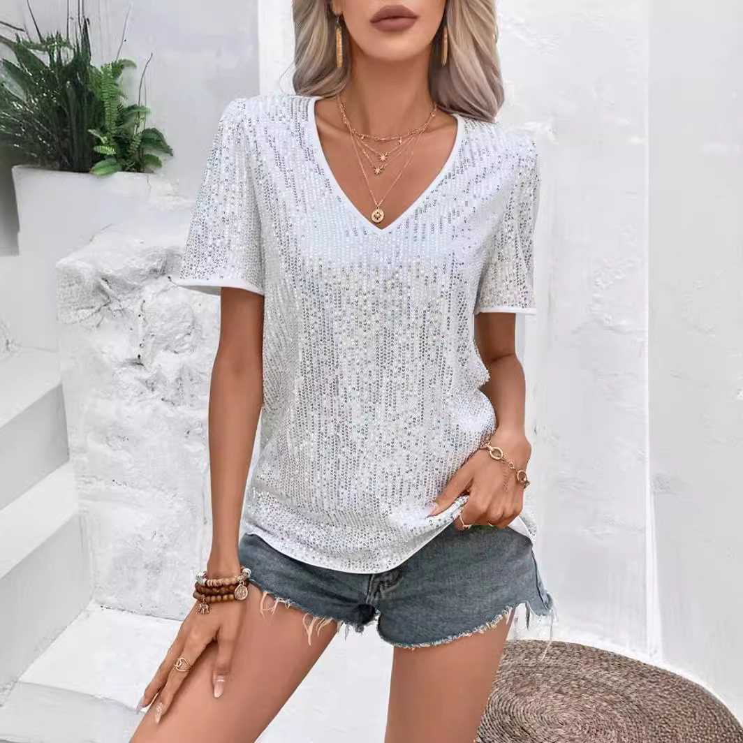 Women's Solid Color Sequin V-neck Loose Short Sleeve