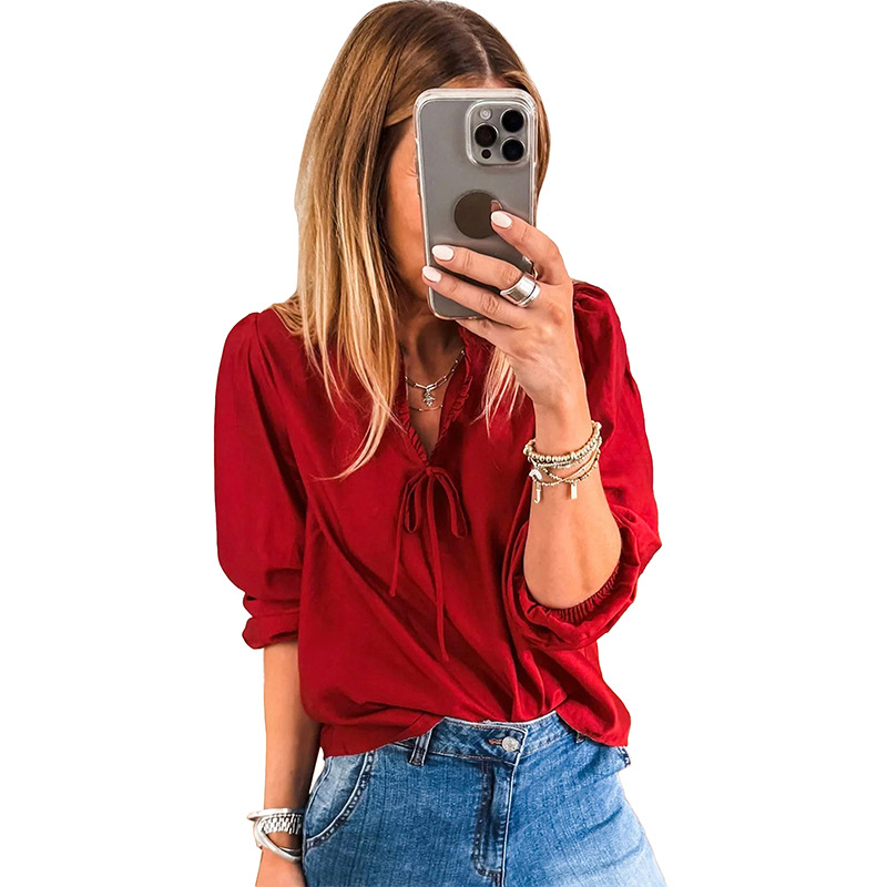 Women's Solid-color V-neck Long-sleeve Chiffon Blouse With Bow Tie Straps