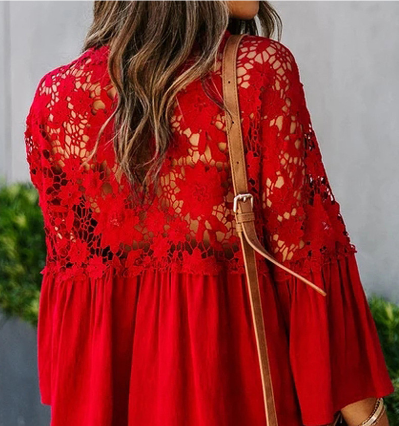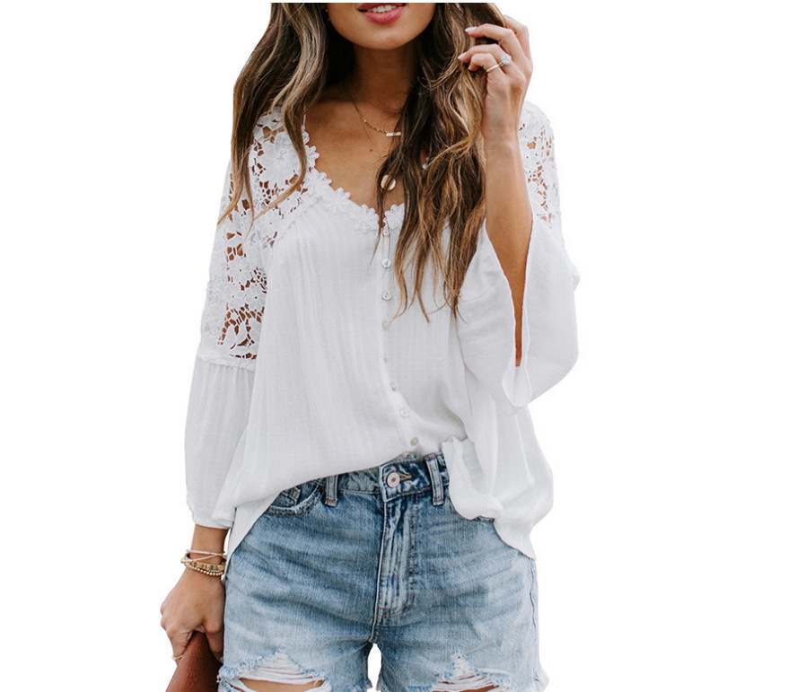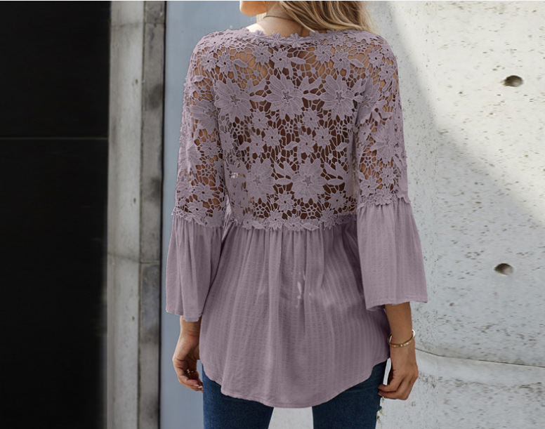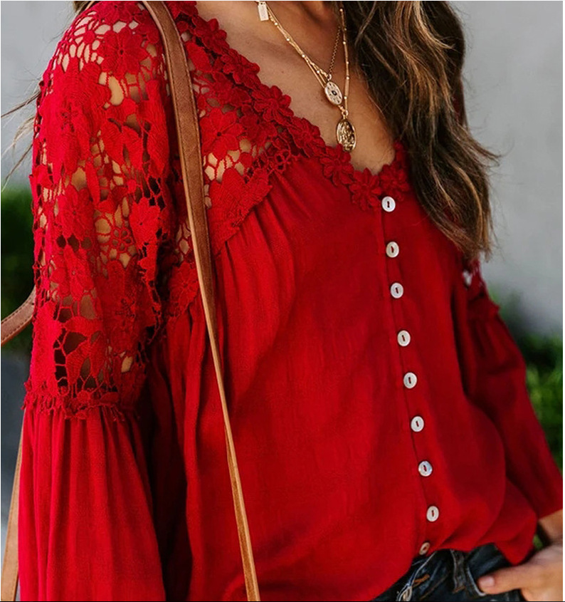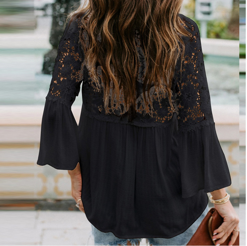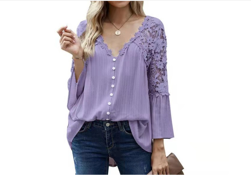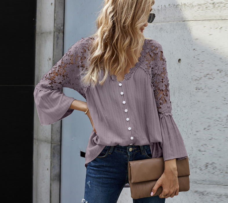 Womens Solid Color V Stitching Breasted Flared Sleeve Top