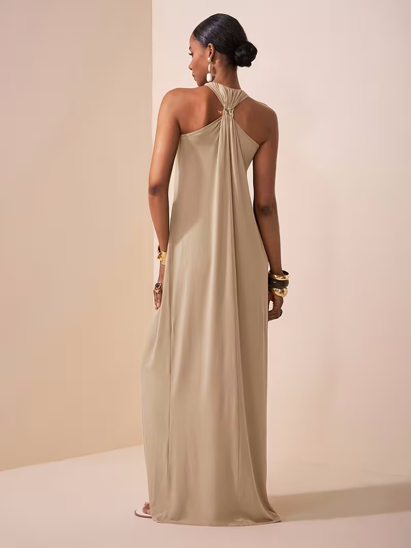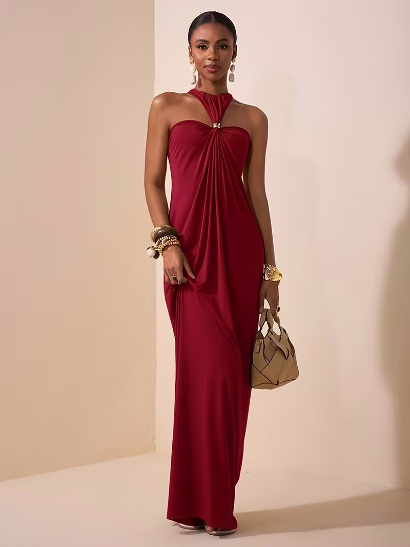 Womens Solid-Colored Halterneck Sleeveless Backless Slim-Fit Dress