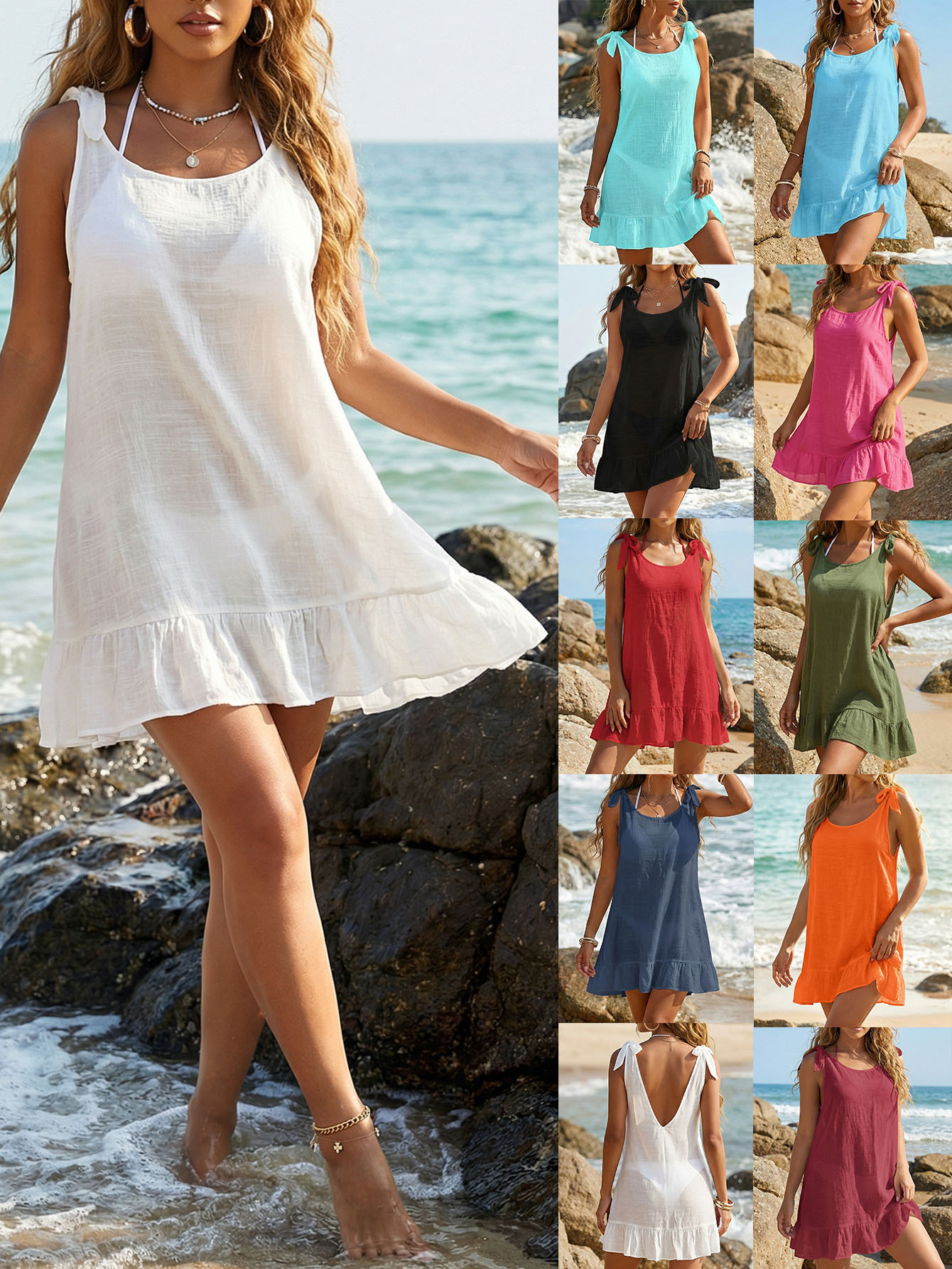 Womens Solid-Colored Ruffle-Trimmed Patchwork Lace-Up Dress