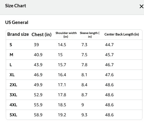 Sizes: S, M, L, XL, 2XL, 3XL, 4XL, 5XL