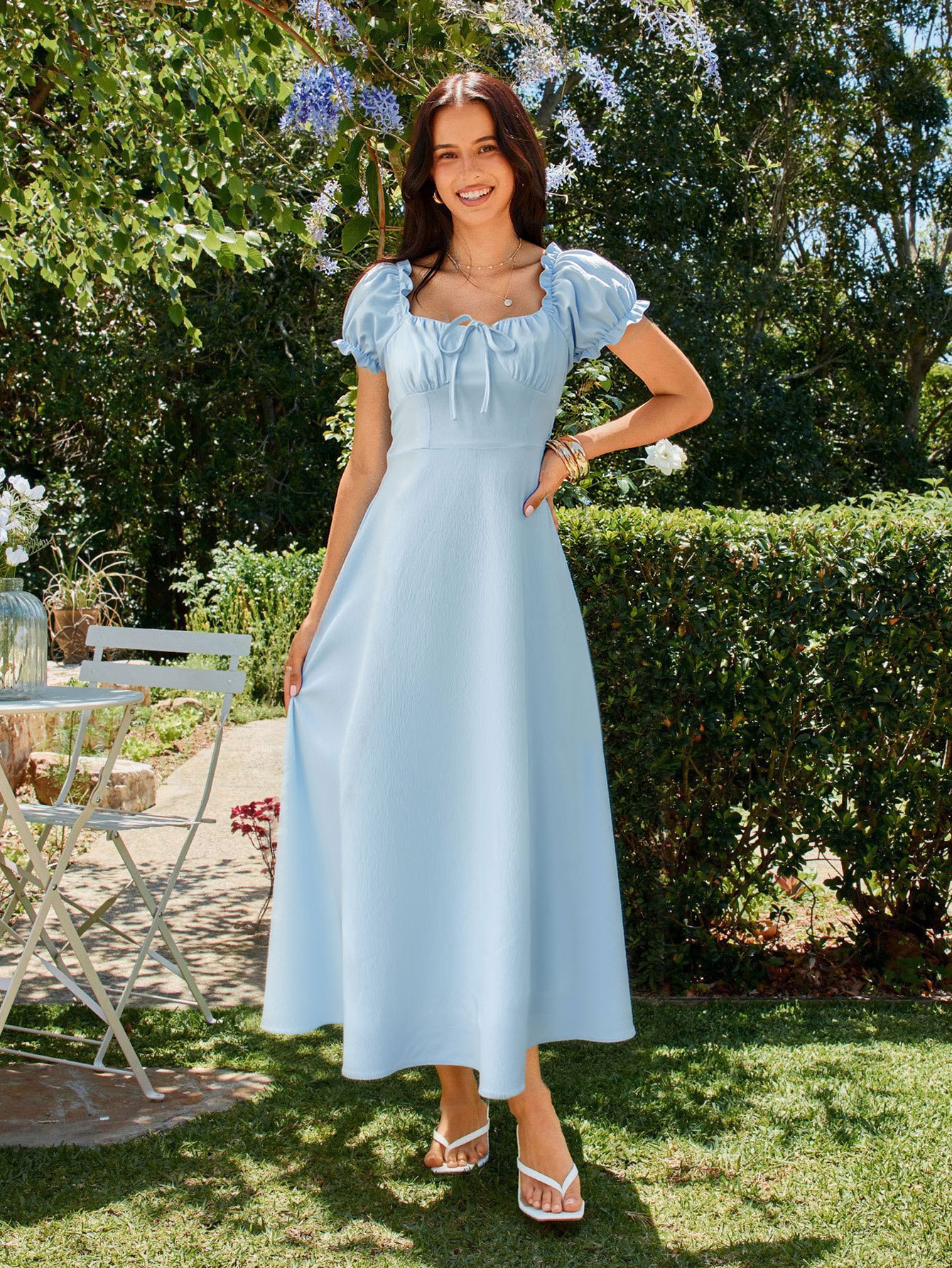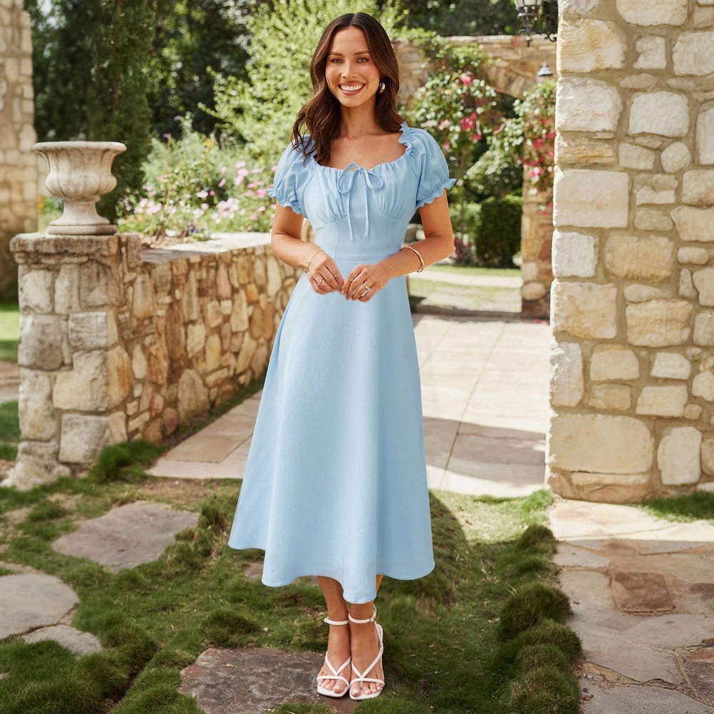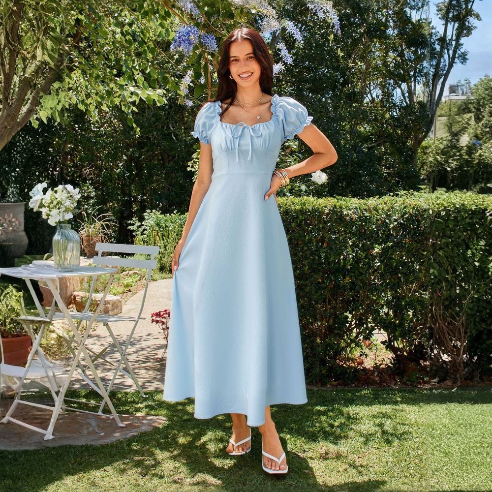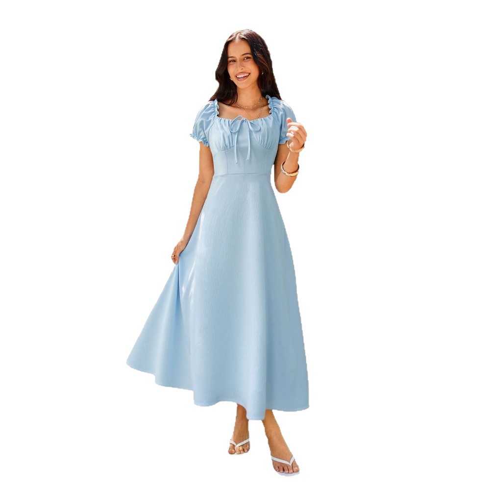 Women's Square-Neck Lace-Up Waist-Cinched Solid-Colored Dress