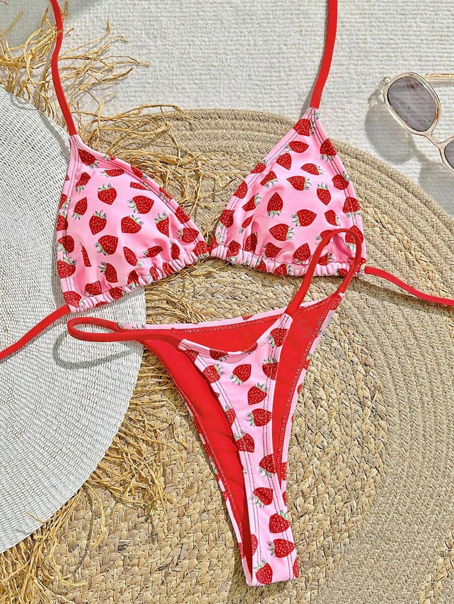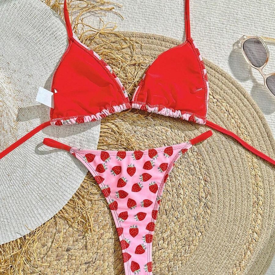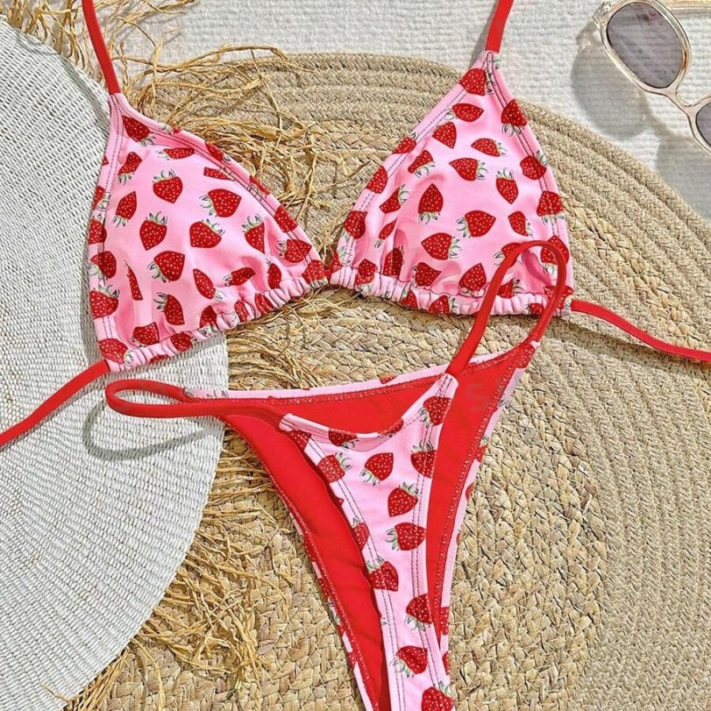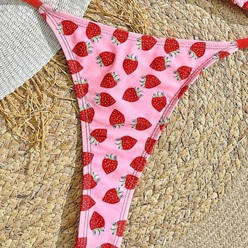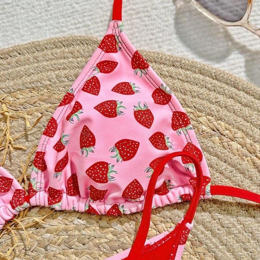 Women's Strawberry Print Bikini Sexy Triangle Bag Lace-up Swimsuit