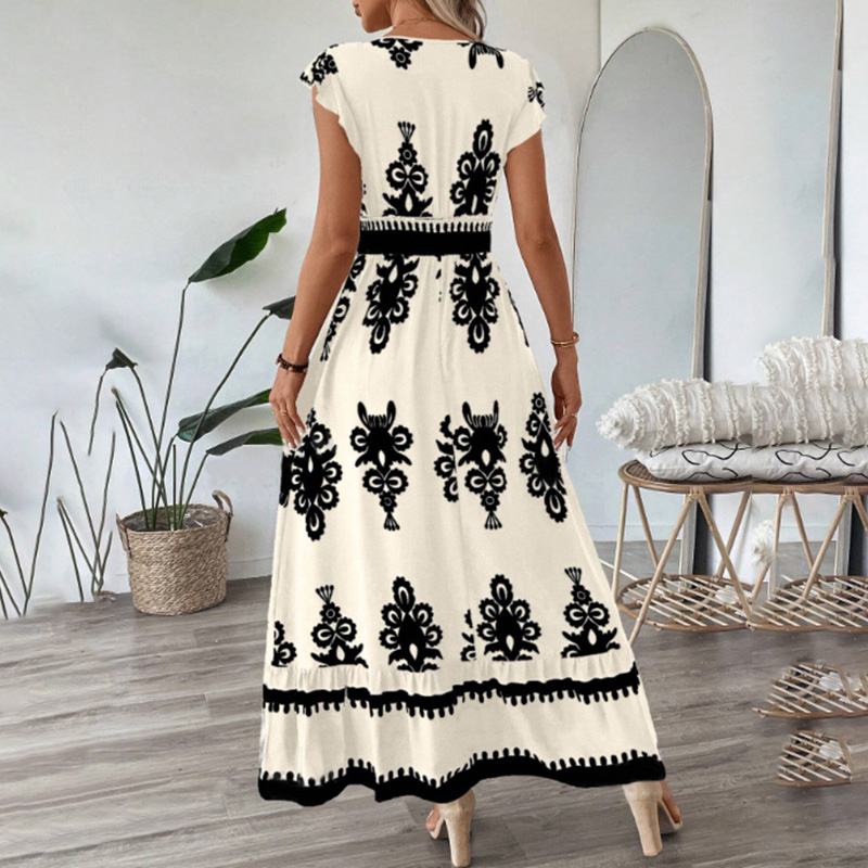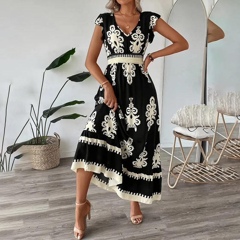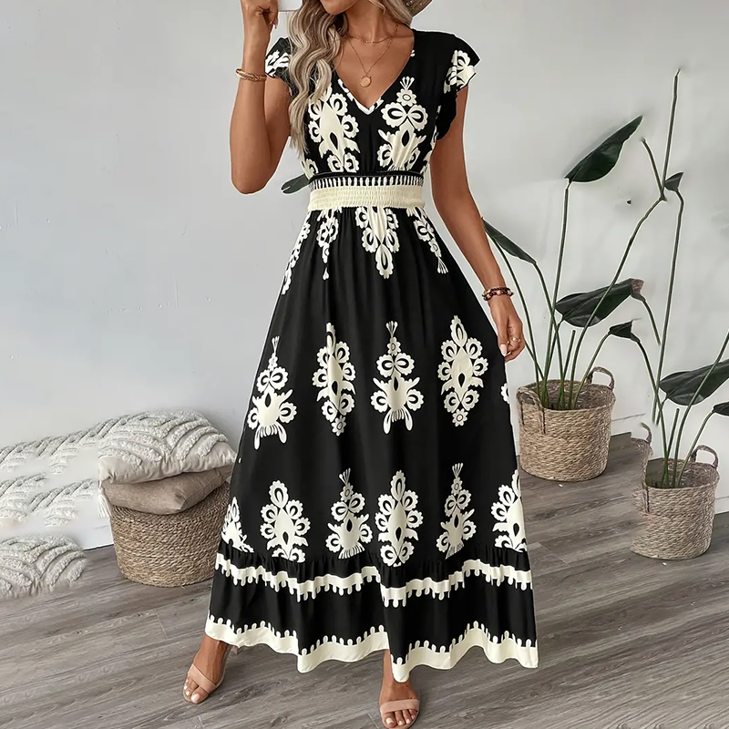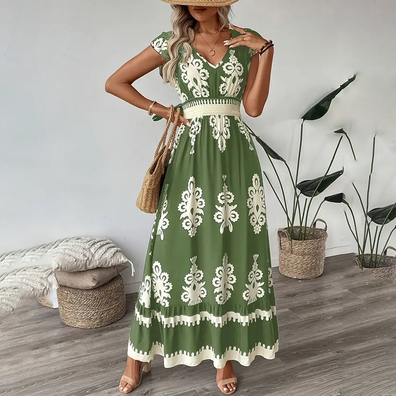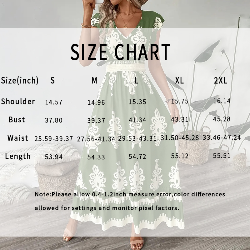 Embrace effortless summer style with this breathable maxi dress, designed for both comfort and boho-chic flair. The smocked waist cinches your silhouette, while the flowy skirt and cap sleeves create a relaxed, feminine look perfect for sunny days.