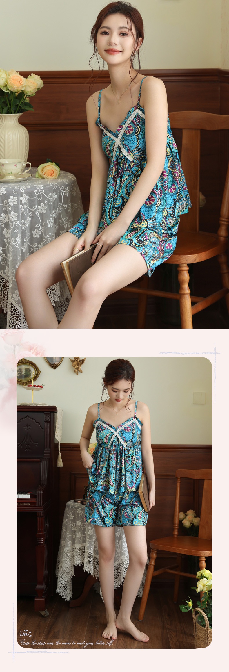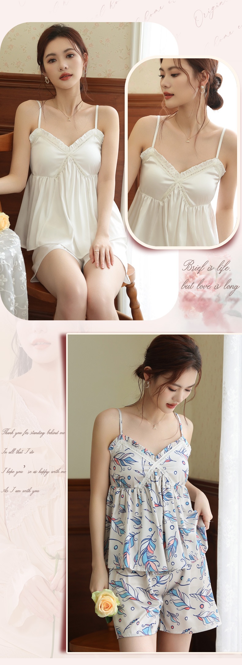 Colors: White, champagne, nude pink, blue print, feather floral
