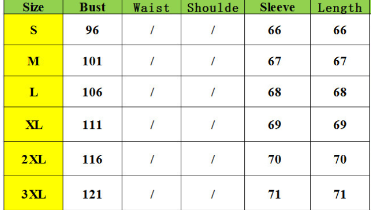 Size:S,M,L,XL,2XL,3XL unit:cm