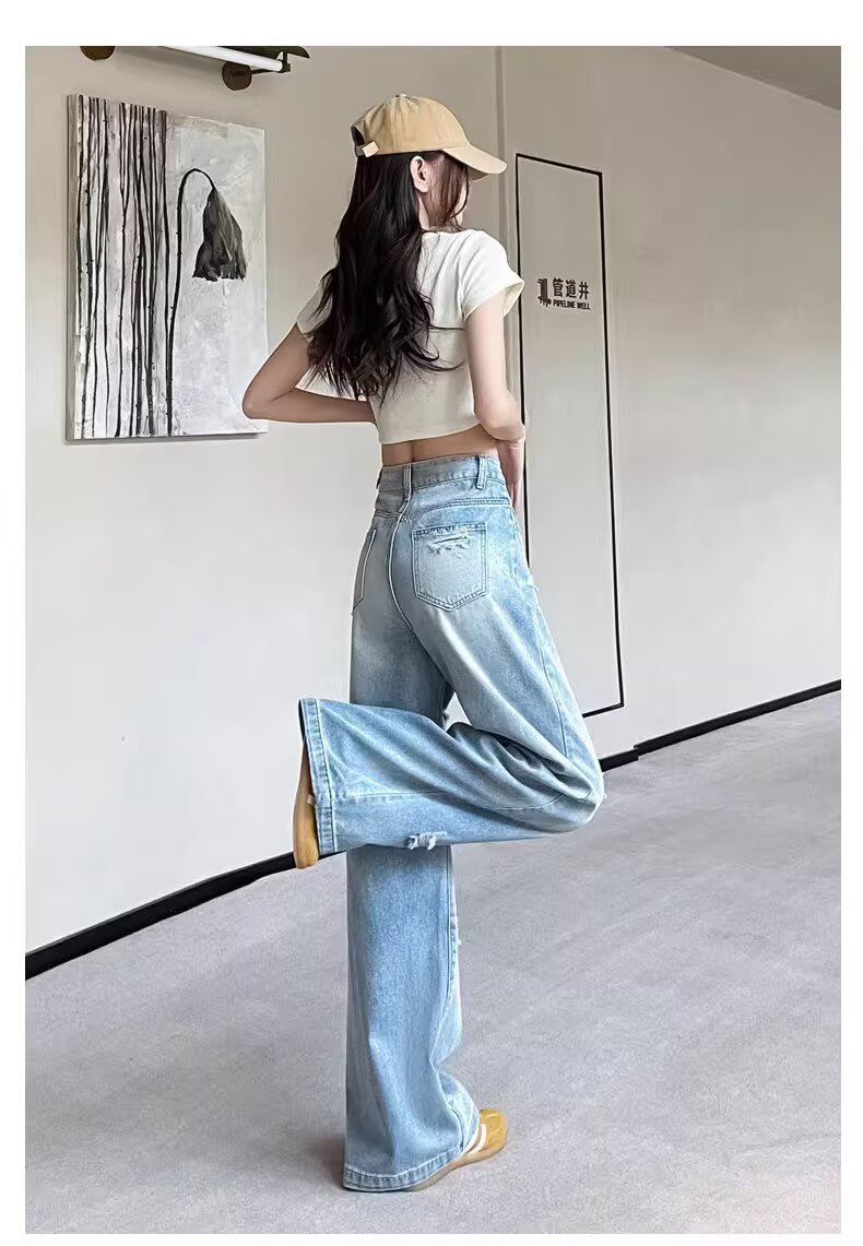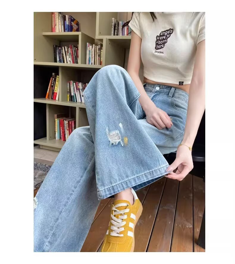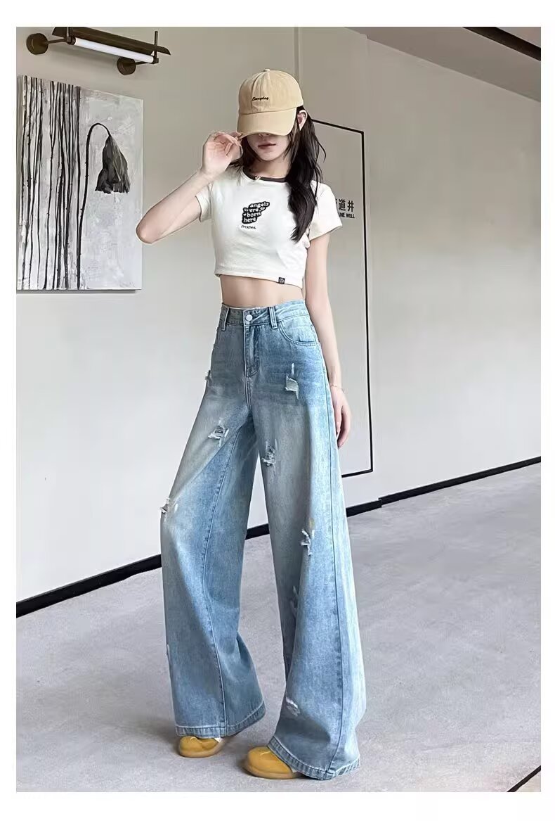 Womens Trendy Loose-fit Ripped Wide-leg Jeans