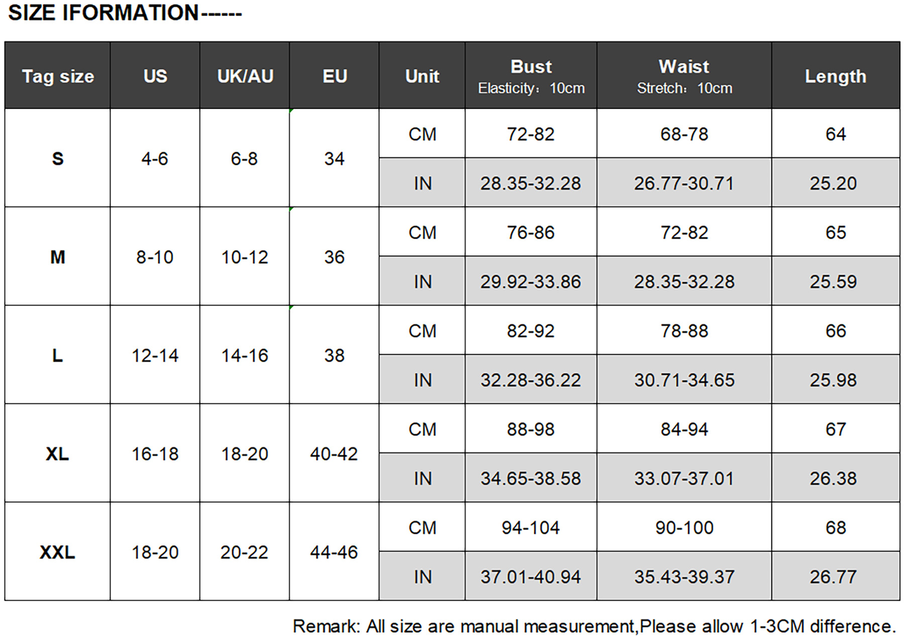 Note: 1. Asian sizes are 1 to 2 sizes smaller than European and American people. Choose the larger size if your size between two sizes. Please allow 2-3cm differences due to manual measurement. 2. Please check the size chart carefully before you buy the item, if you don't know how to choose size, please contact our customer service. 3.As you know, the different computers display colors differently, the color of the actual item may vary slightly from the following images.