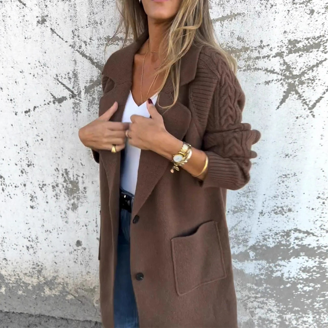 Women's Twist Knit Stitching Lapel Large Coat