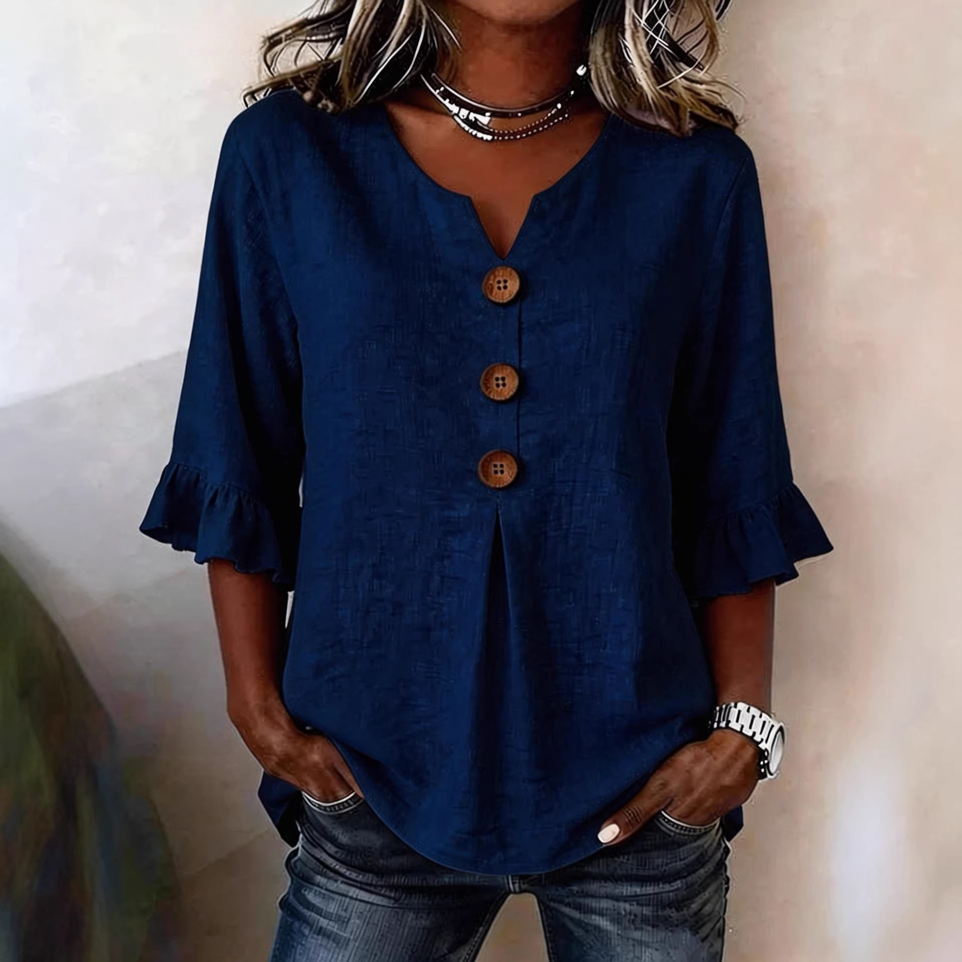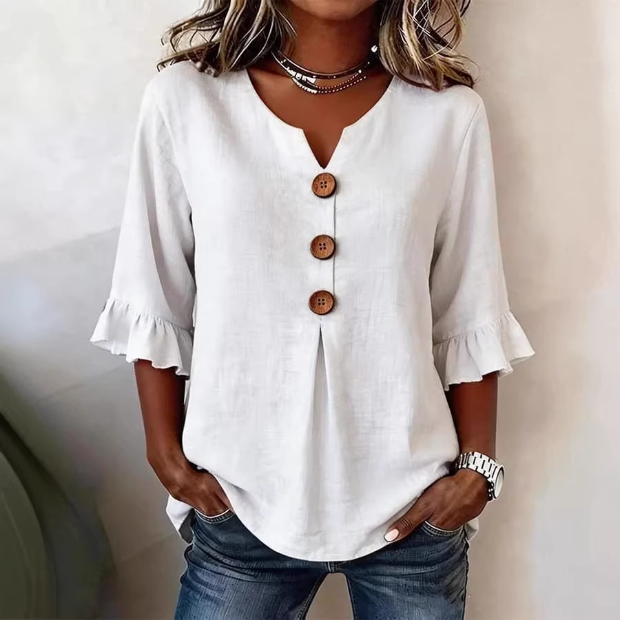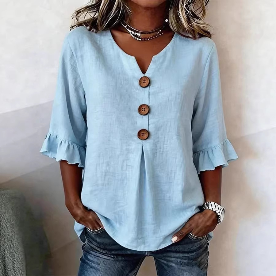 Women's V-neck Cotton-linen Button-up Top
