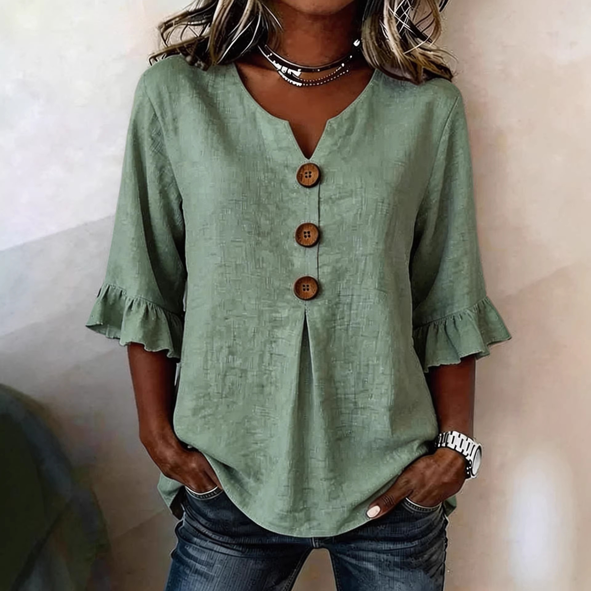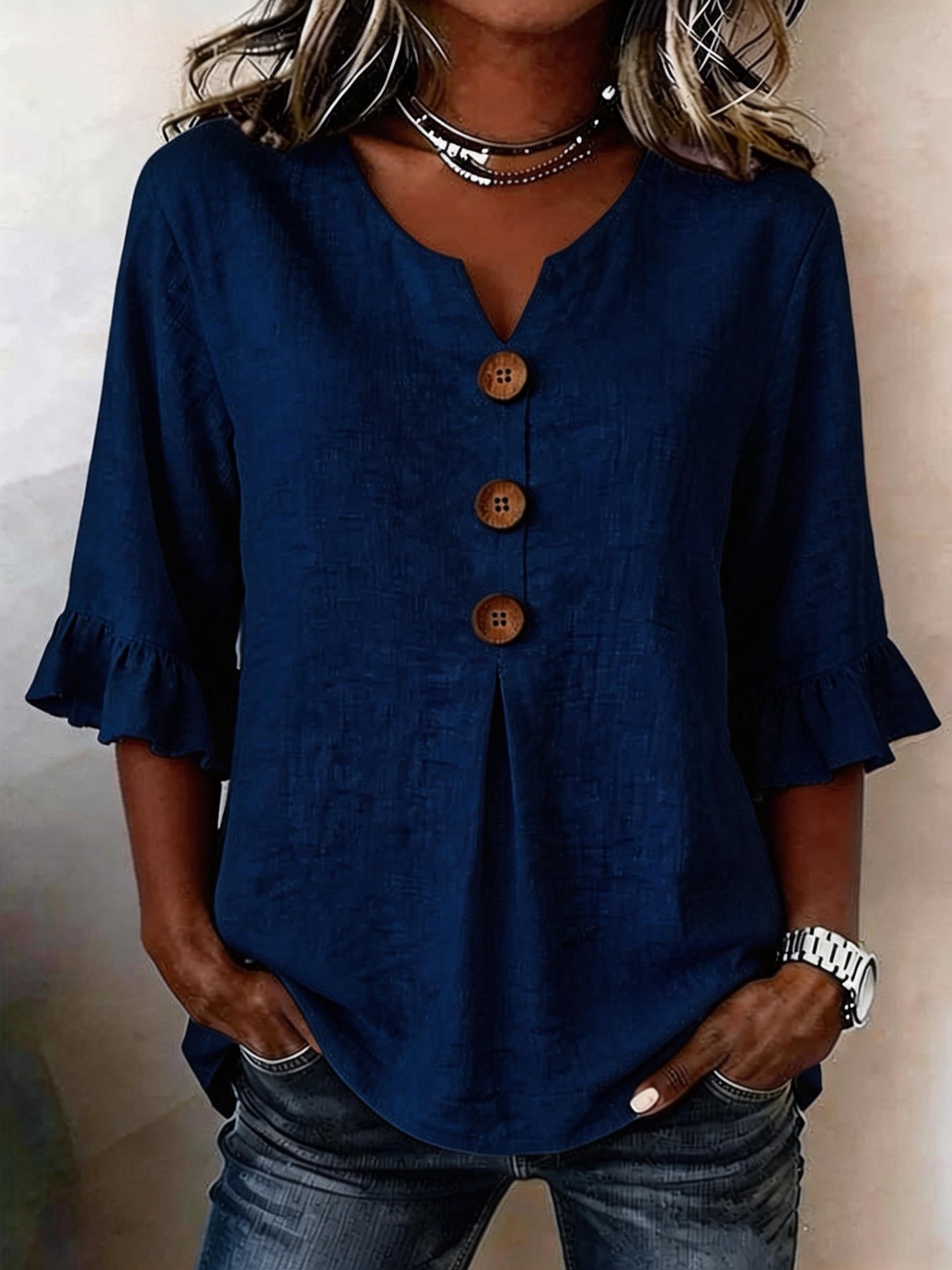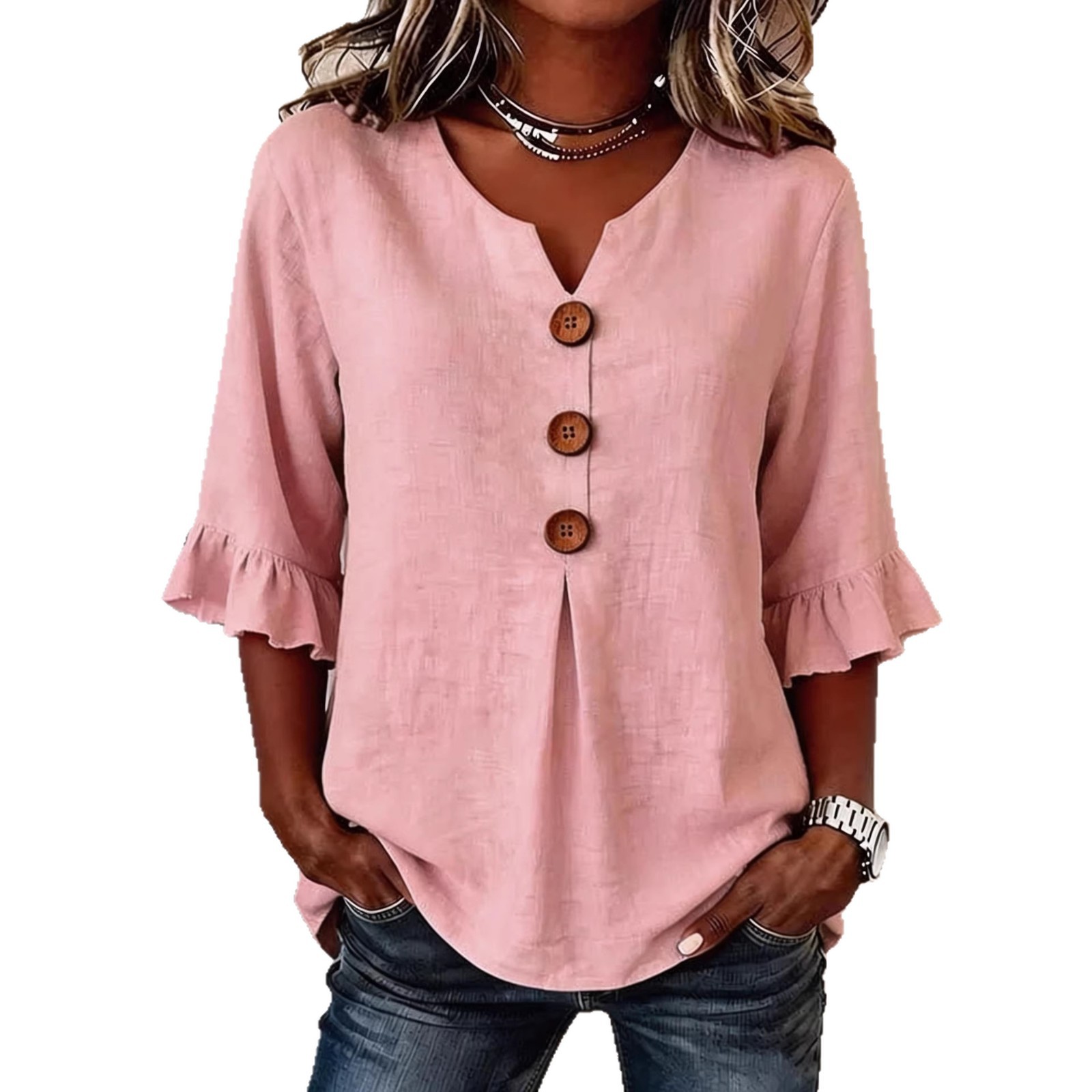 Women's V-neck Cotton-linen Button-up Top