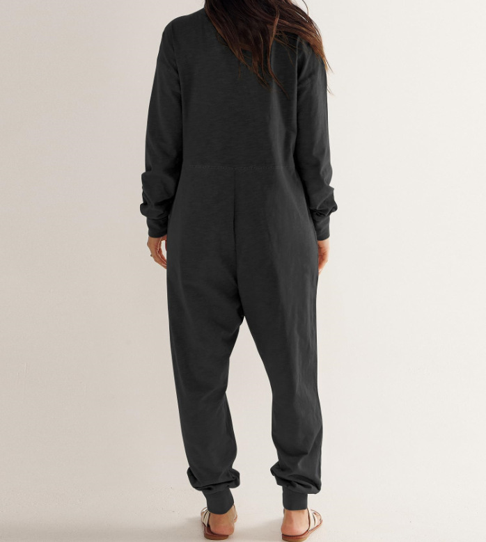 Women's V-neck Long Sleeve Solid Color Loose Jumpsuit With Two Side Pockets