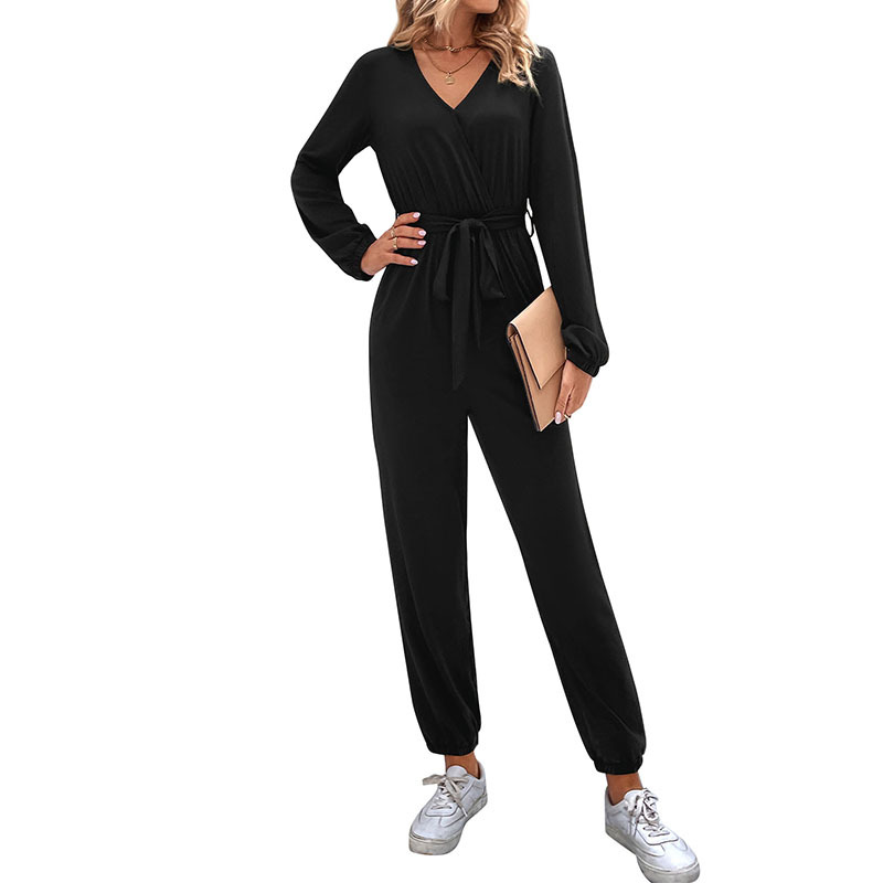 Women's V-neck Long-sleeved Lace-up Ankle-tied Jumpsuit