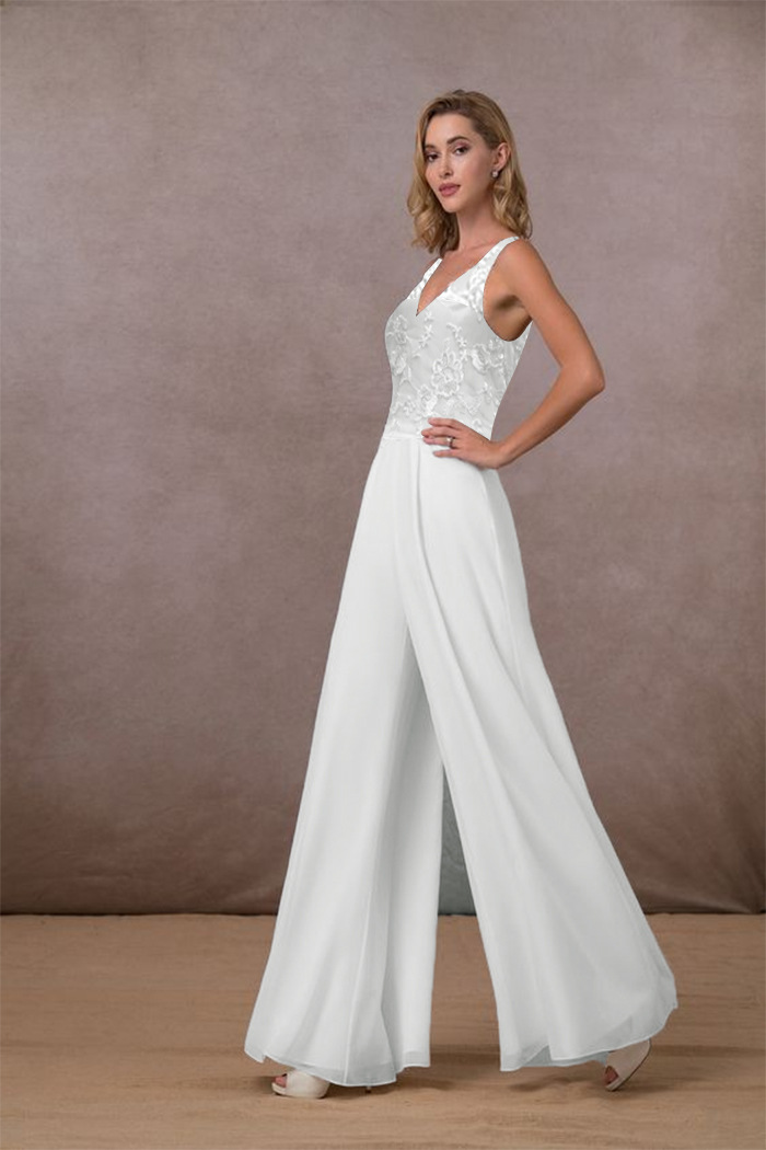 Women's V-neck Mid-waist Sleeveless Wide-leg Chiffon Pants White