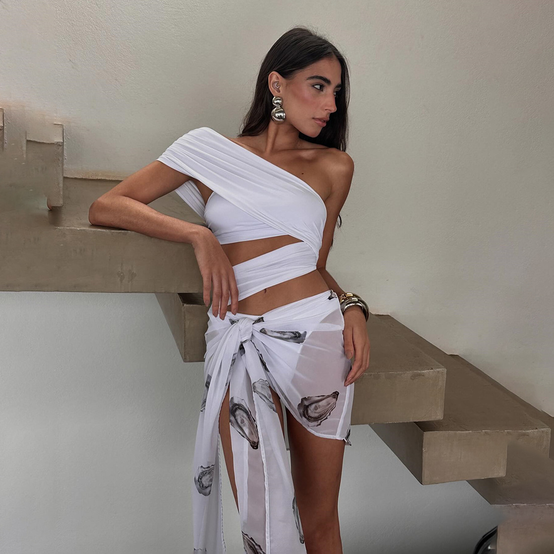 Womens V-neck Off-shoulder Hollow-out Top And Printed Skirt Set