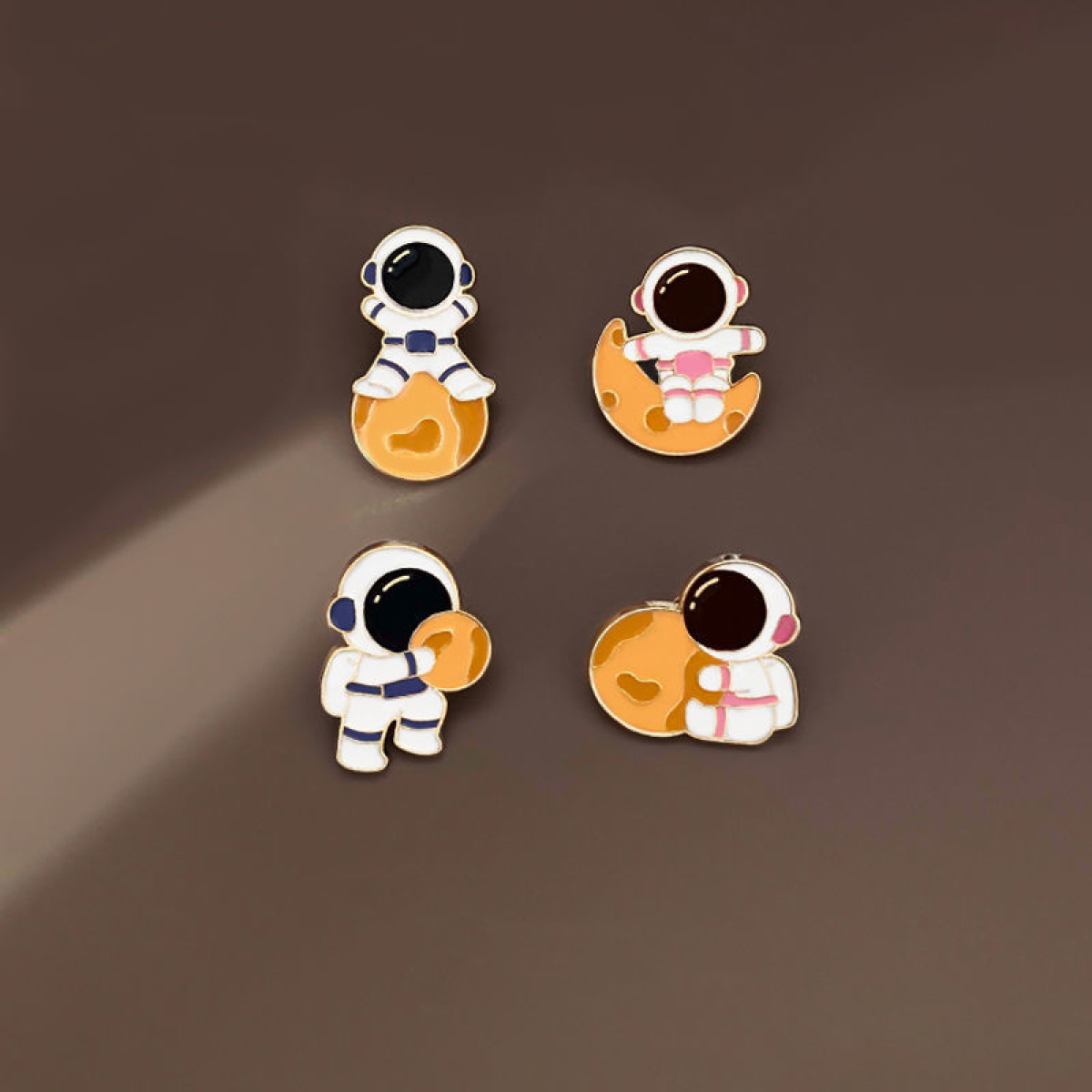 Color: astronaut [holding the moon], astronaut [holding the moon], astronaut [relying on the moon], astronaut [sitting on the moon]