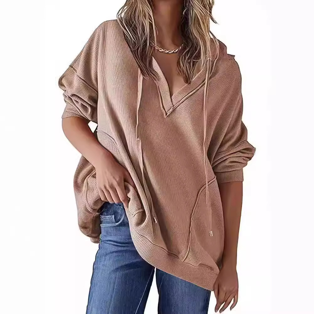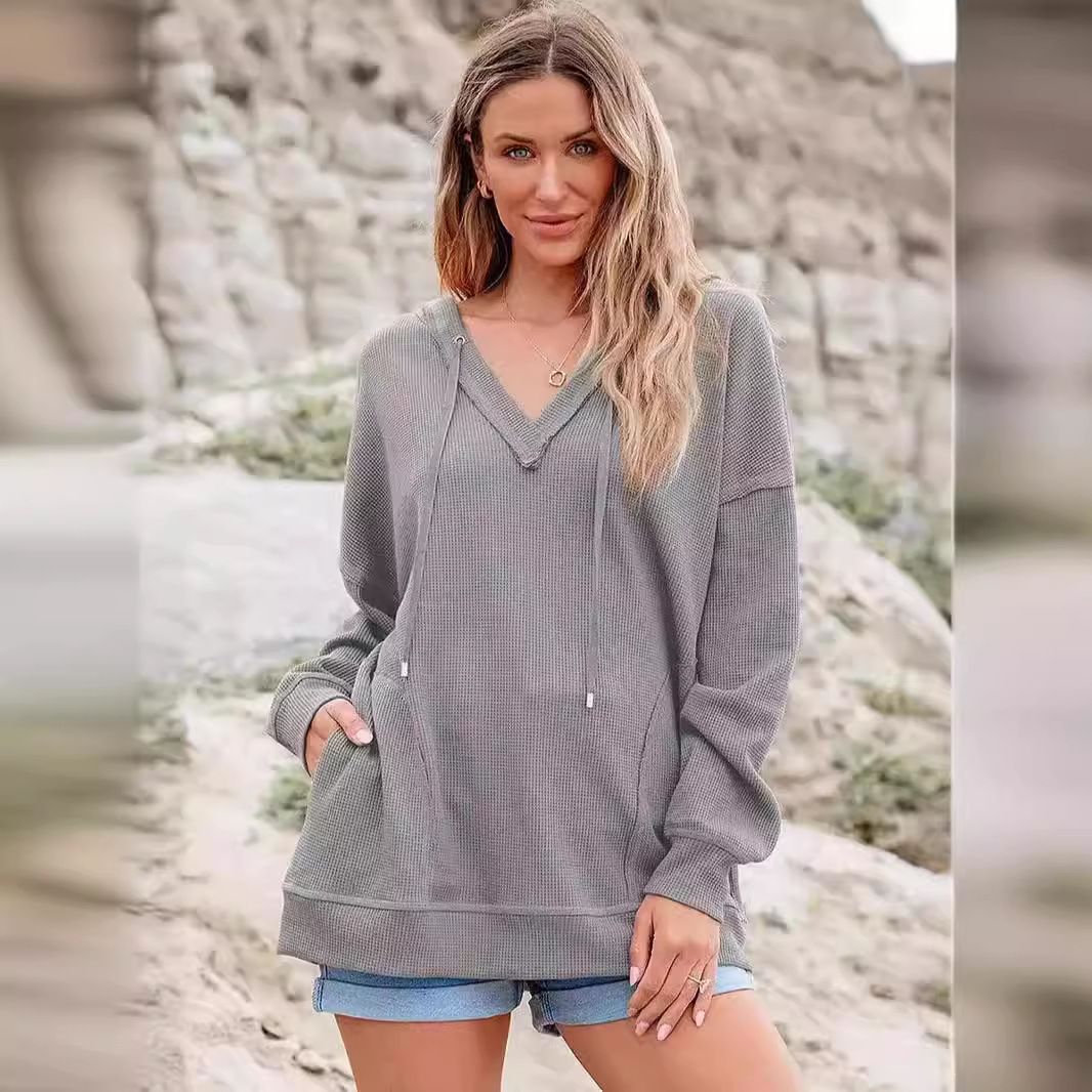 Women's V-neck Waffle Solid Color Long-sleeved Hoodie
