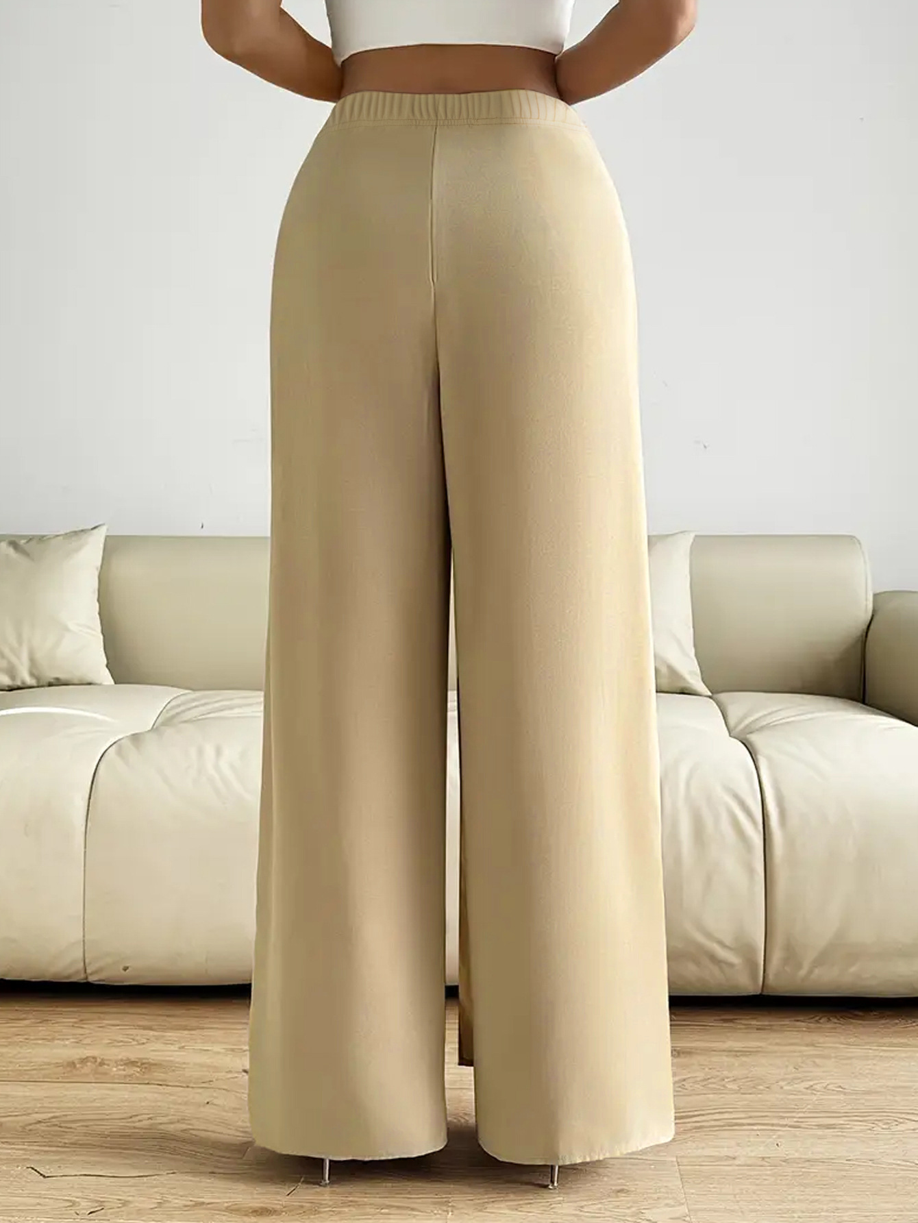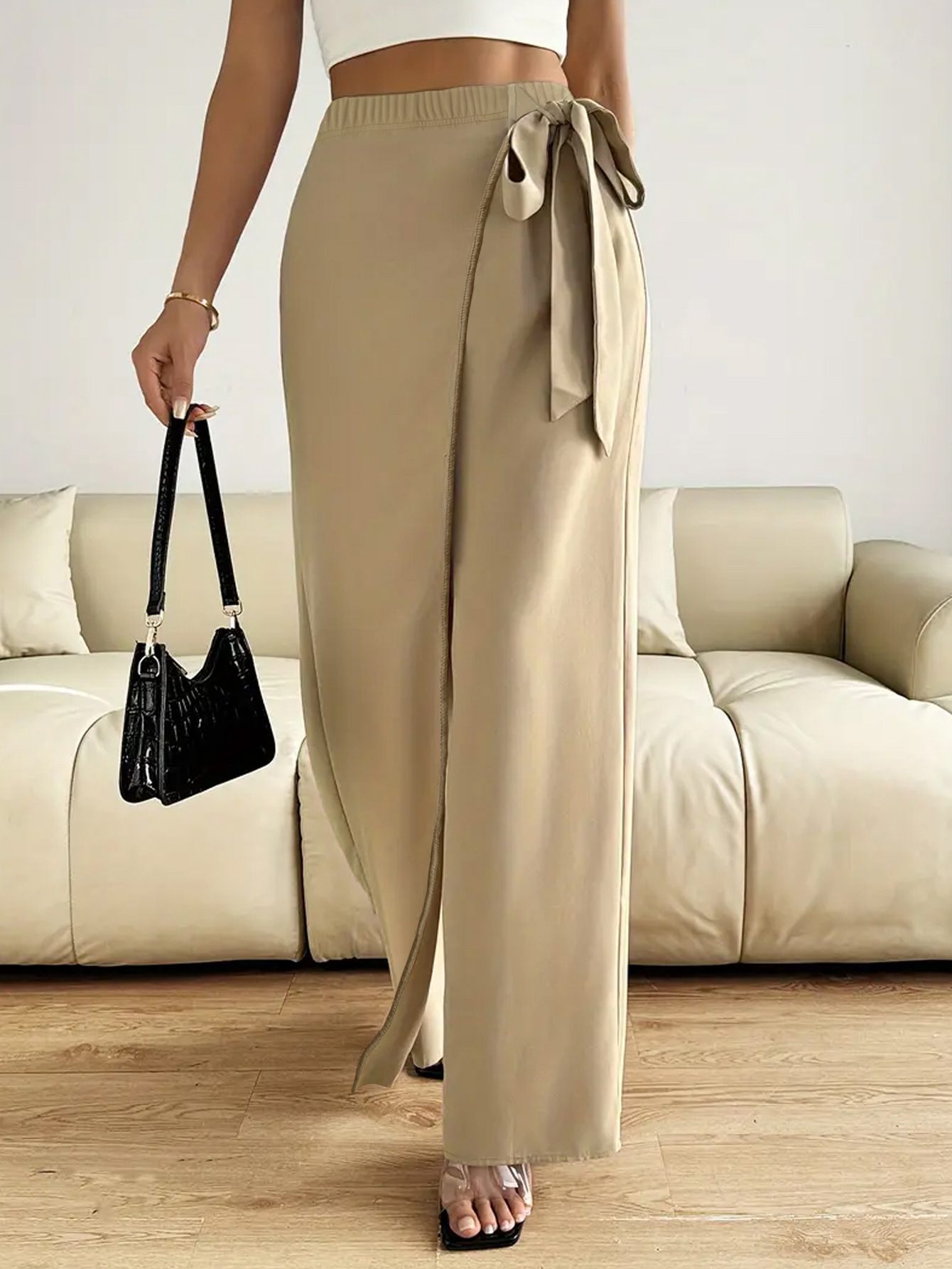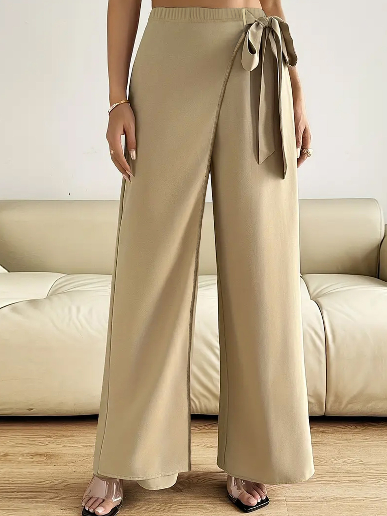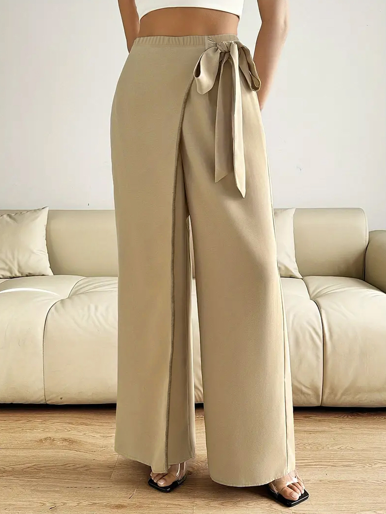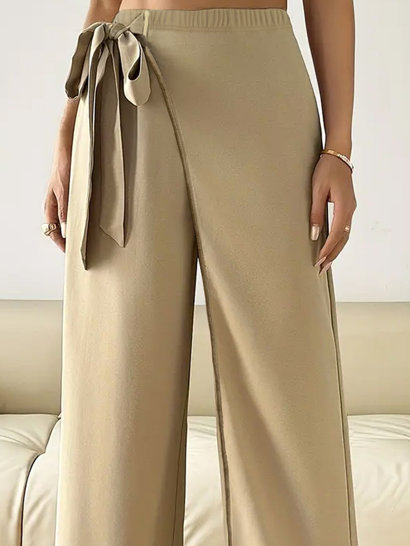 Features: High waist, straight-leg silhouette, three-dimensional tailoring, tie-detail accents, elegant and office-appropriate