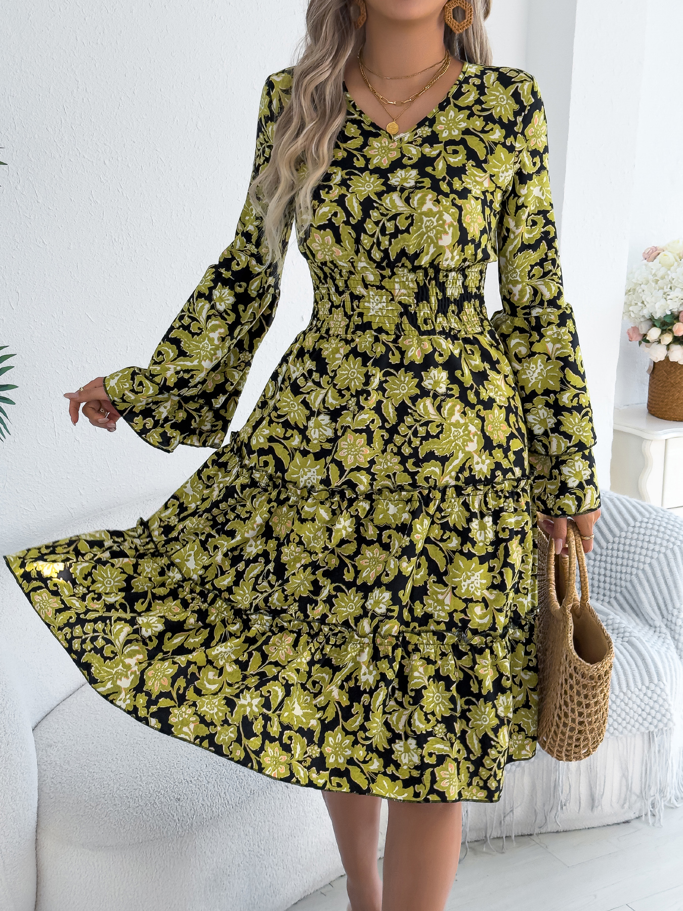 Women's Vintage Bell Sleeve Ruffle Trim Tie Waist A-Line Dress