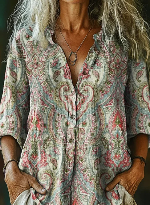 Women's Vintage Ethnic Floral Art Print Linen And Cotton V-neck Casual Shirt